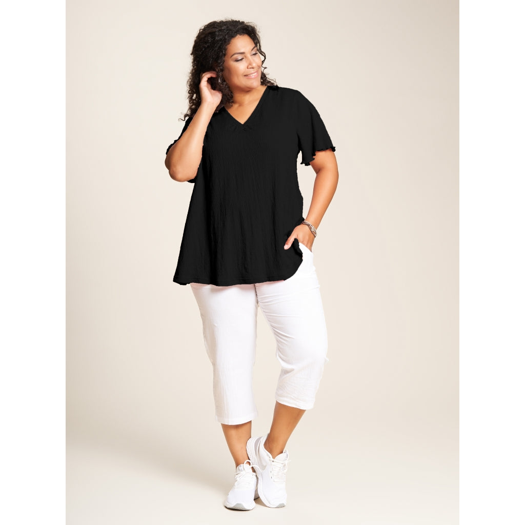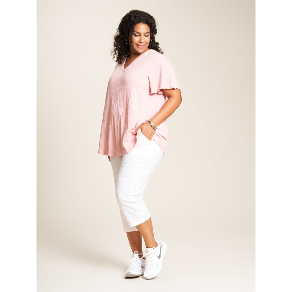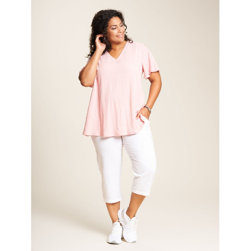 Feminine T-shirt in solid colour in high quality cotton mix. A-shape with V-neck and wide short sleeves.