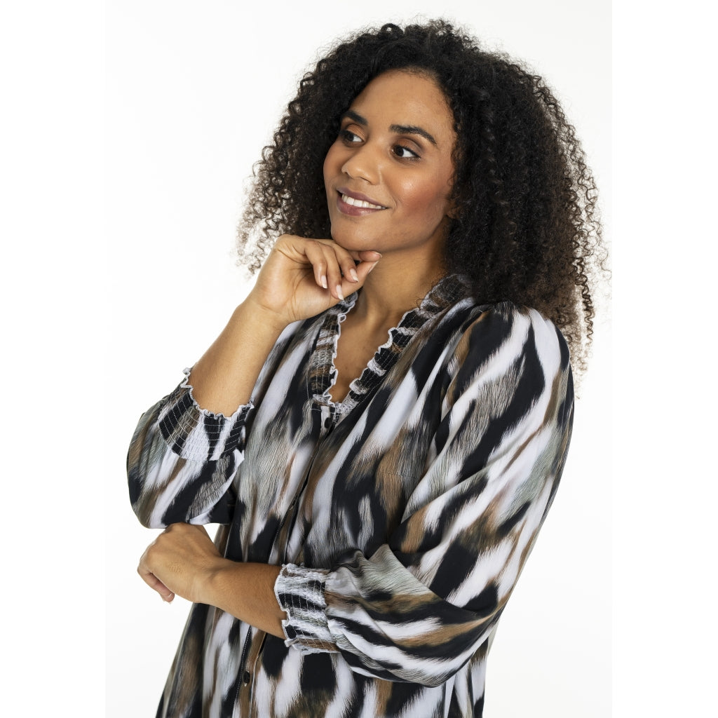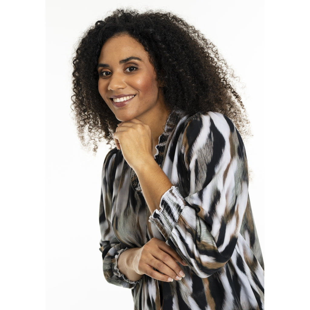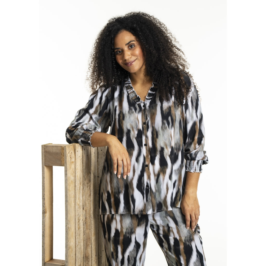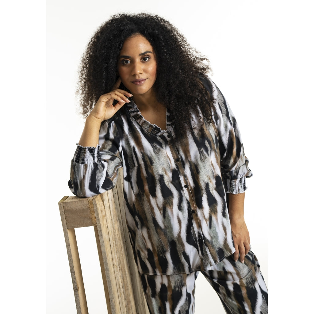 Elegant skjorte i viskosekvalitet med flot brun-grå-sort-hvid-mixfarvet print. Skjorten er med smock-krave, der ender i V-halsudskæring og efterfølgende gennemgående knaplukning. Lange ærmer med smock-manchetter.
