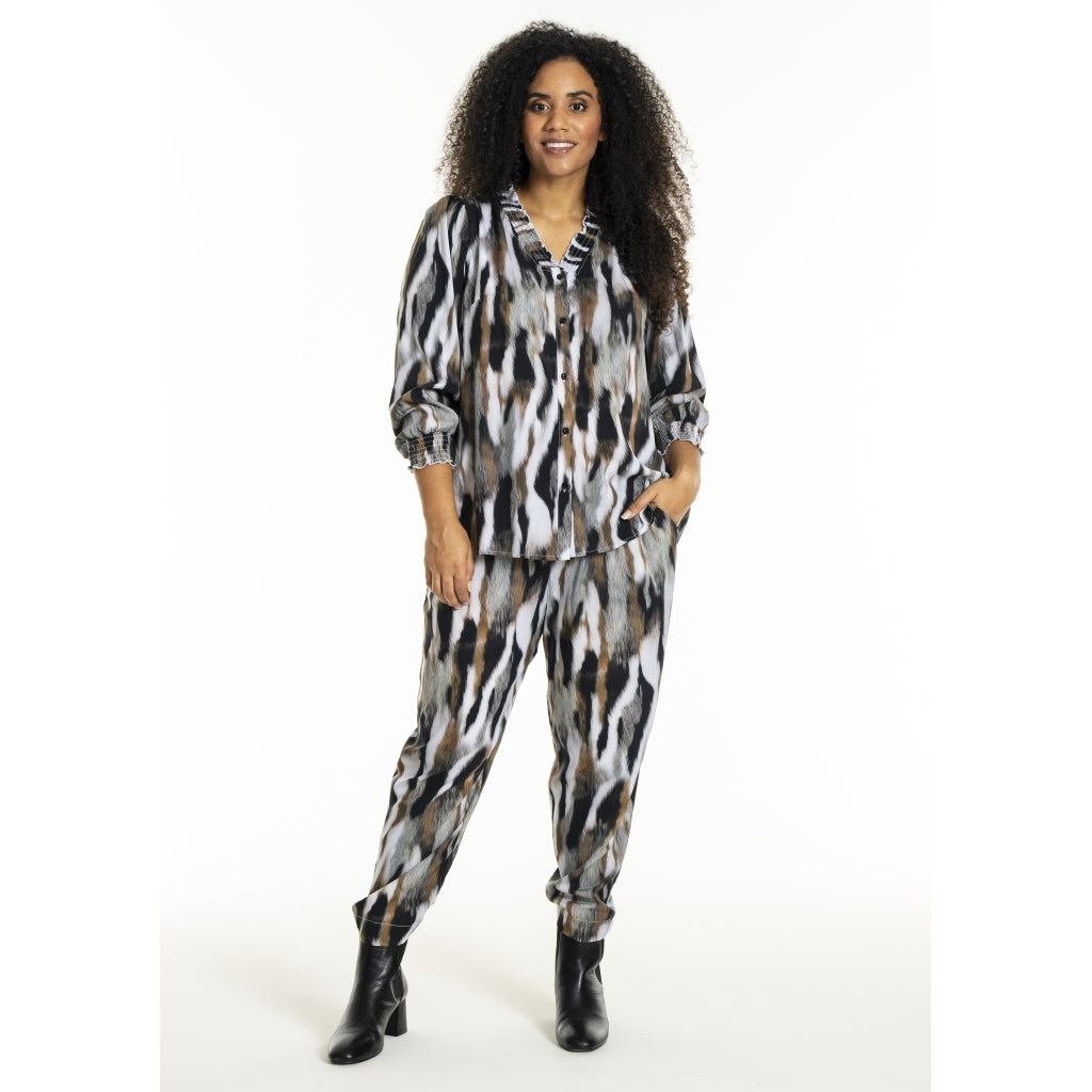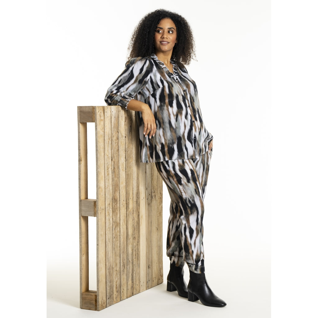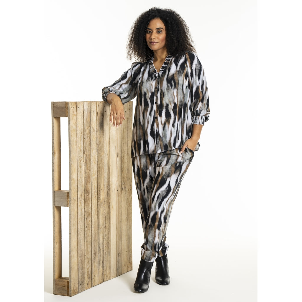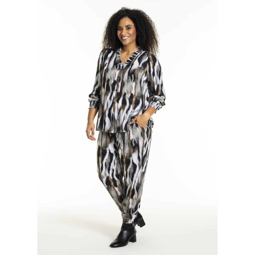 Elegant skjorte i viskosekvalitet med flot brun-grå-sort-hvid-mixfarvet print. Skjorten er med smock-krave, der ender i V-halsudskæring og efterfølgende gennemgående knaplukning. Lange ærmer med smock-manchetter.