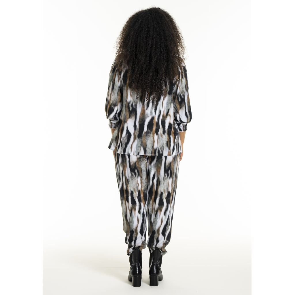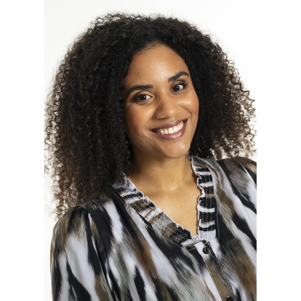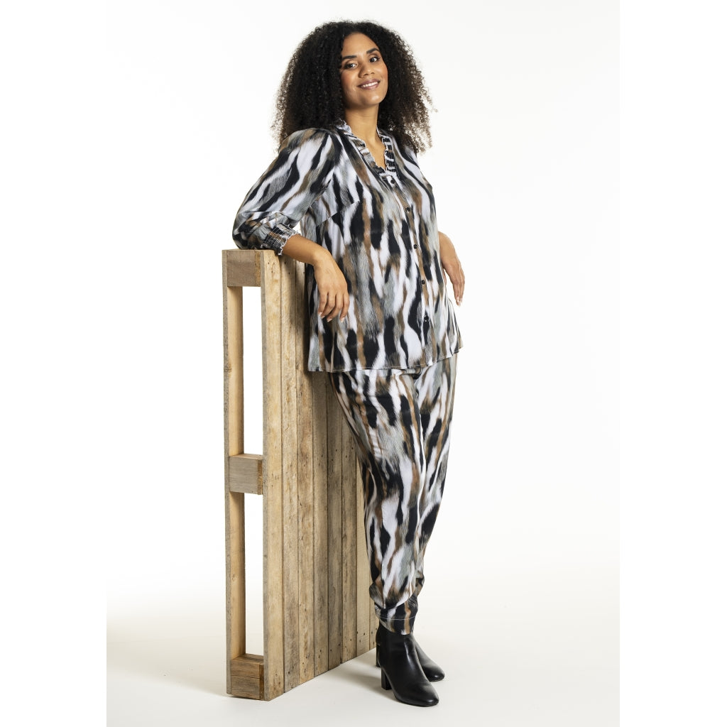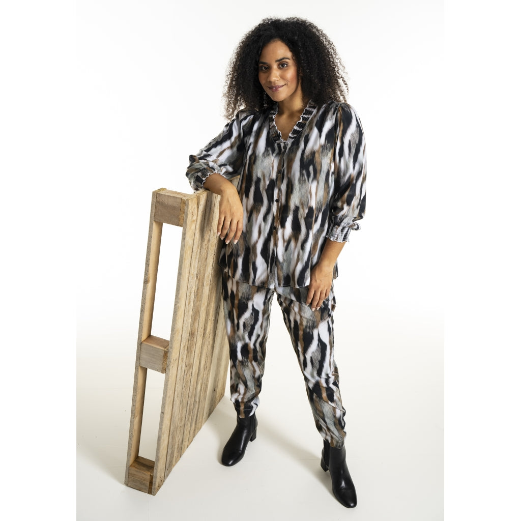 Elegant skjorte i viskosekvalitet med flot brun-grå-sort-hvid-mixfarvet print. Skjorten er med smock-krave, der ender i V-halsudskæring og efterfølgende gennemgående knaplukning. Lange ærmer med smock-manchetter.