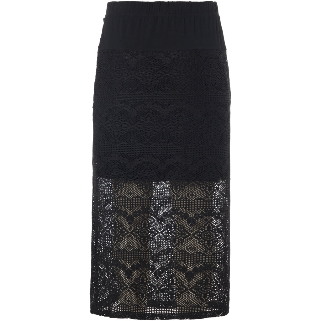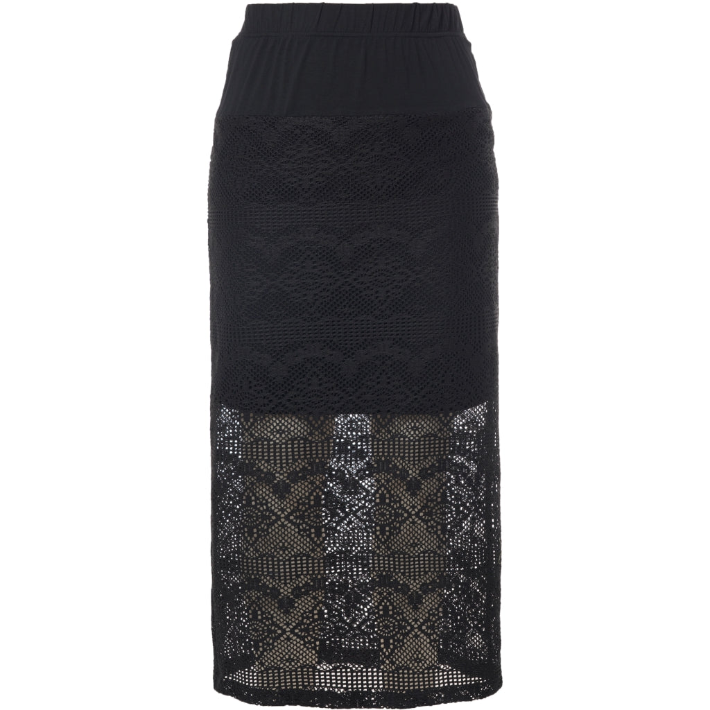 Elegant, lang nederdel i sort med hæklet lag. Påsat inderlag af jerseystof fra taljen til over knæet. Elastik i taljen.