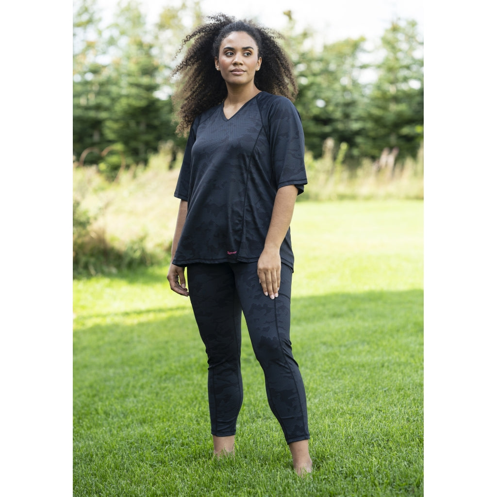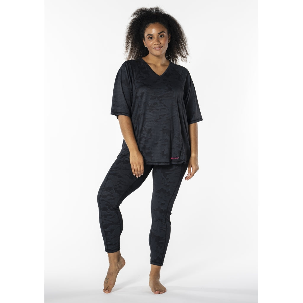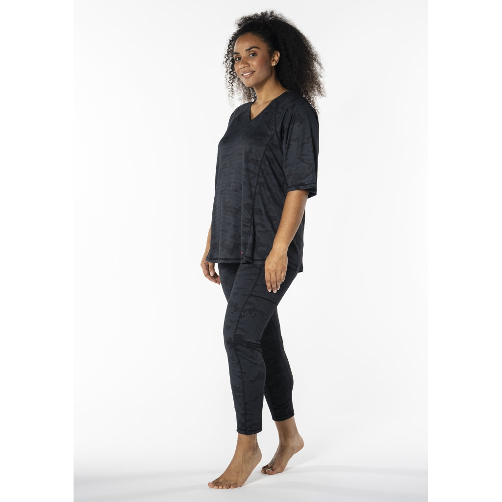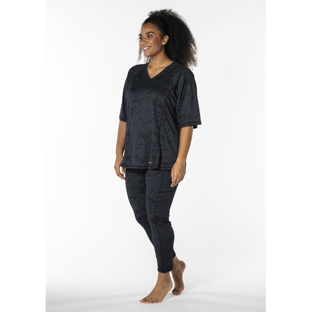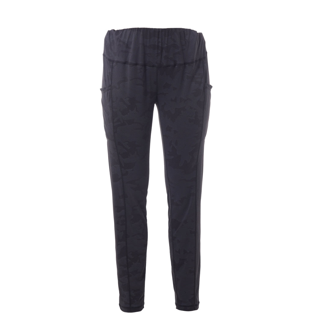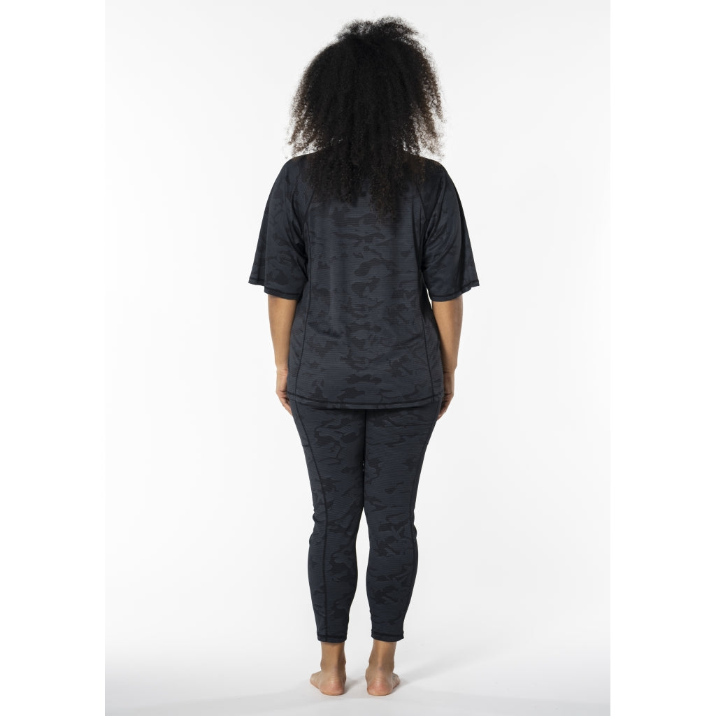 Et par fede fitness leggings i 7/8-længde lavet af nylon-polyestermix. Stylen er med sort og grå camouflage print. Bred elastikkant i taljen og tætsiddende fit.