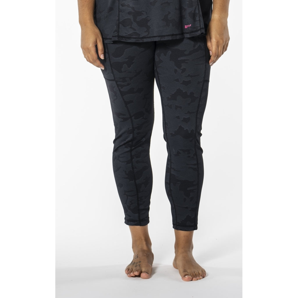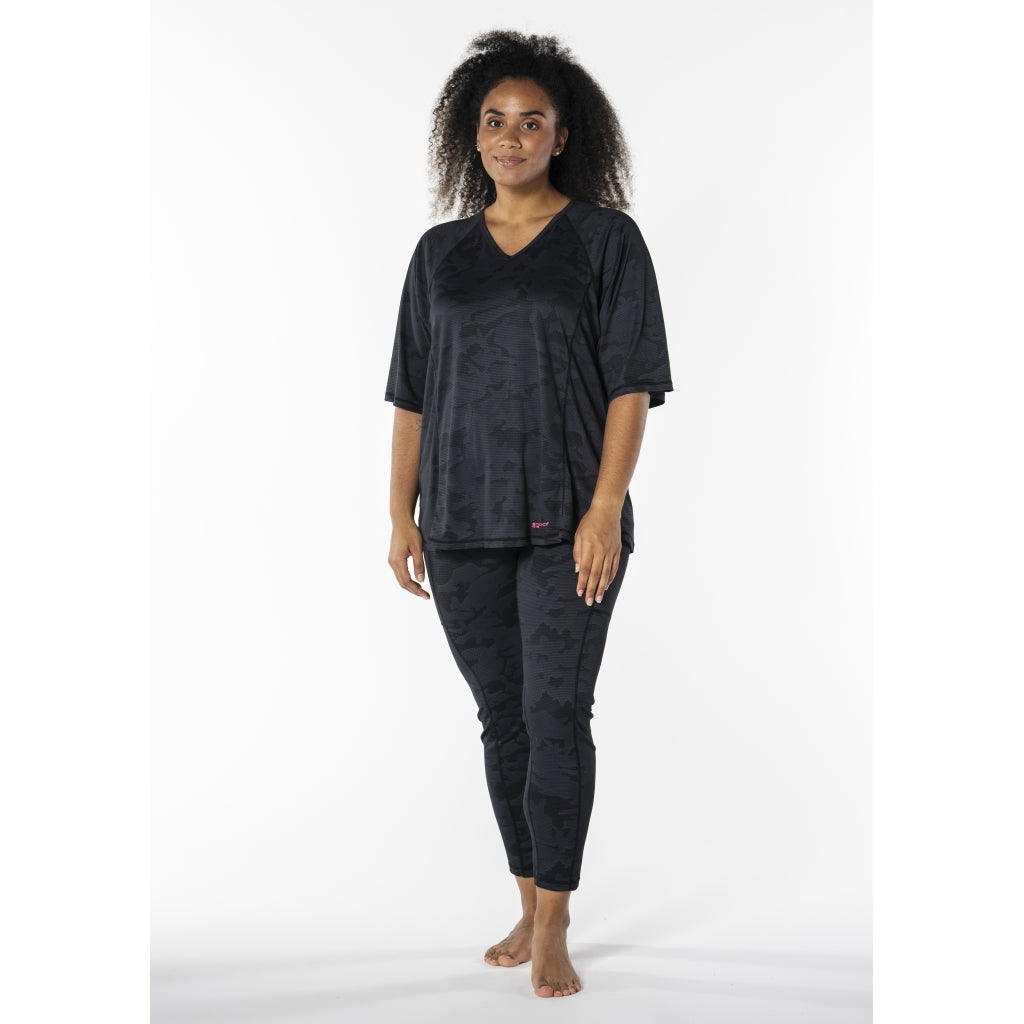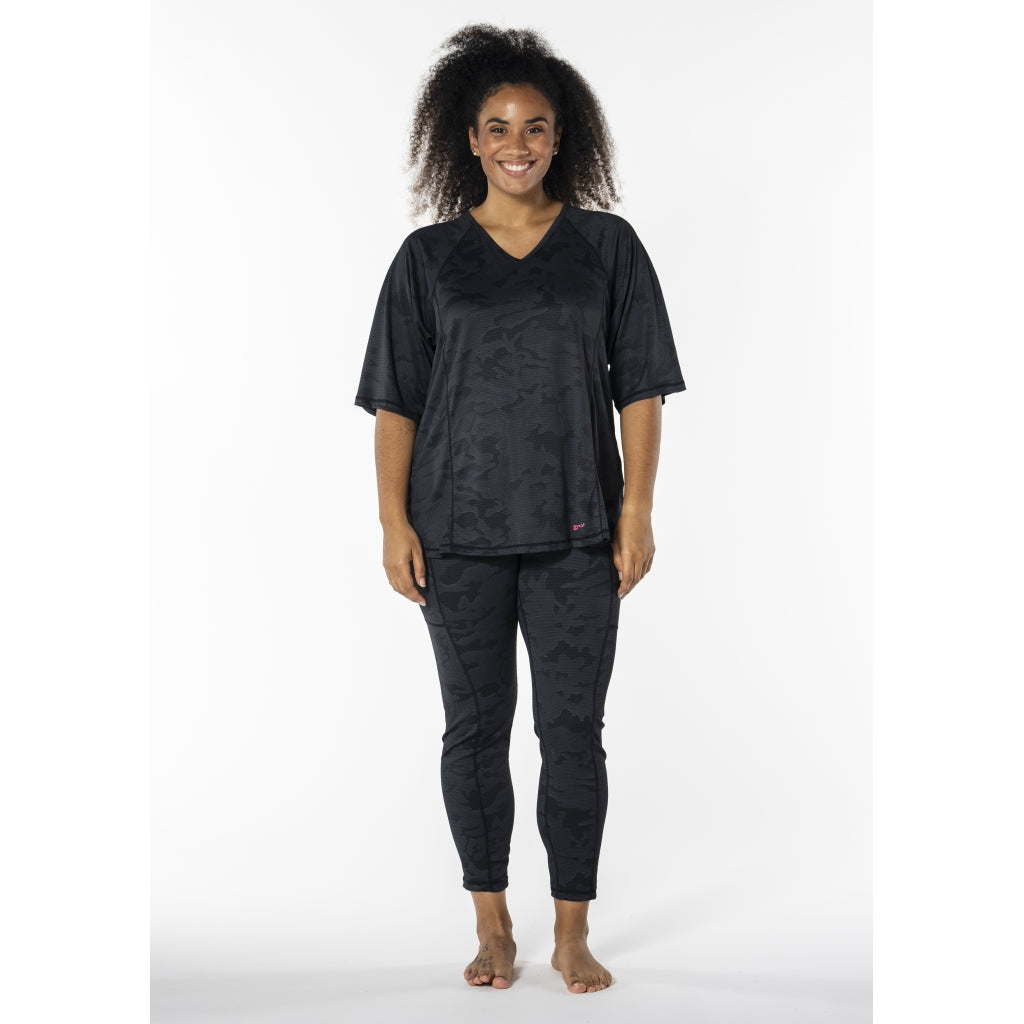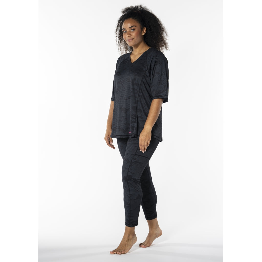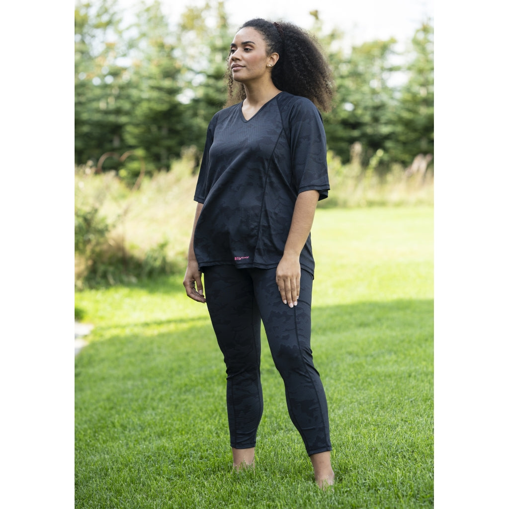 Et par fede fitness leggings i 7/8-længde lavet af nylon-polyestermix. Stylen er med sort og grå camouflage print. Bred elastikkant i taljen og tætsiddende fit.