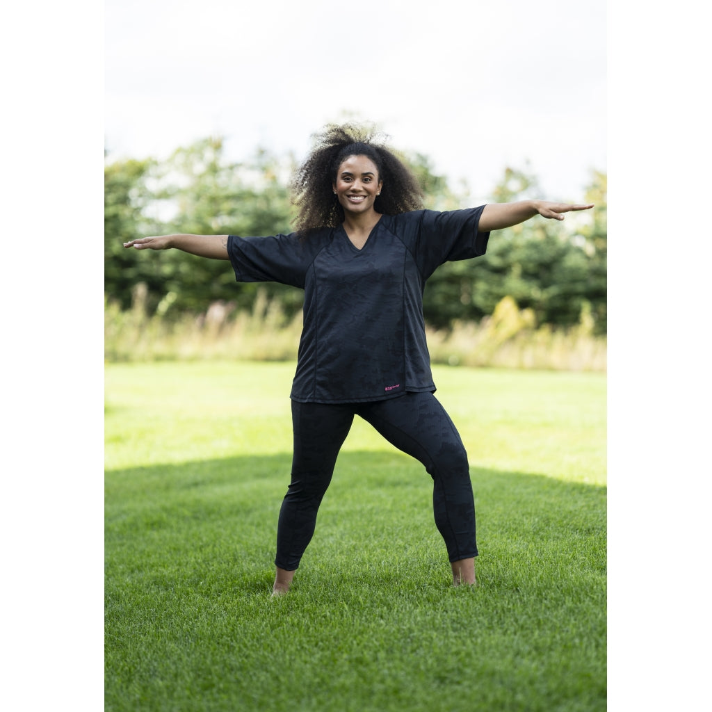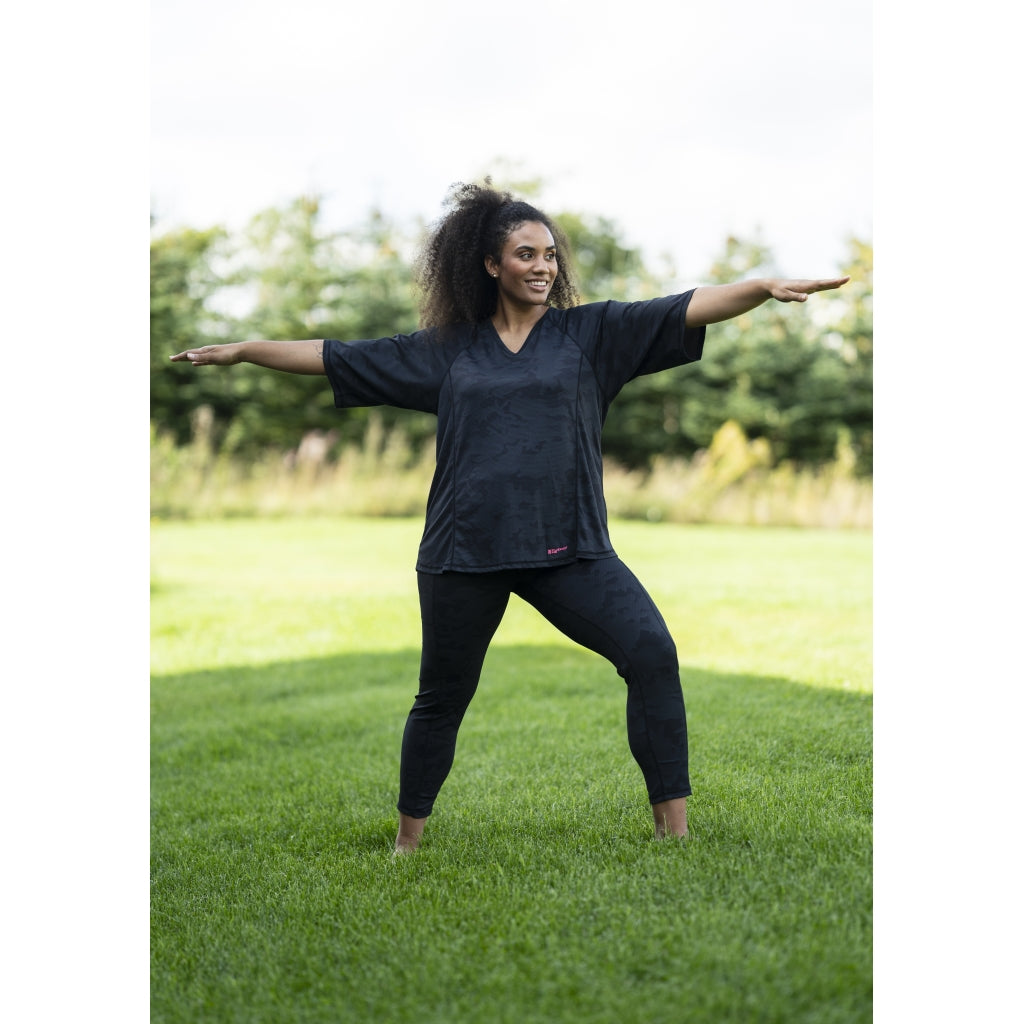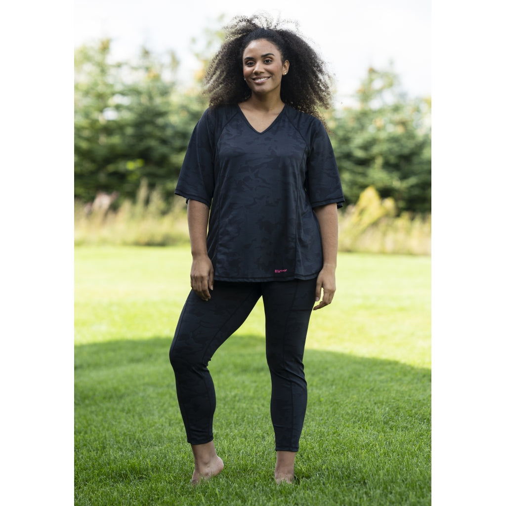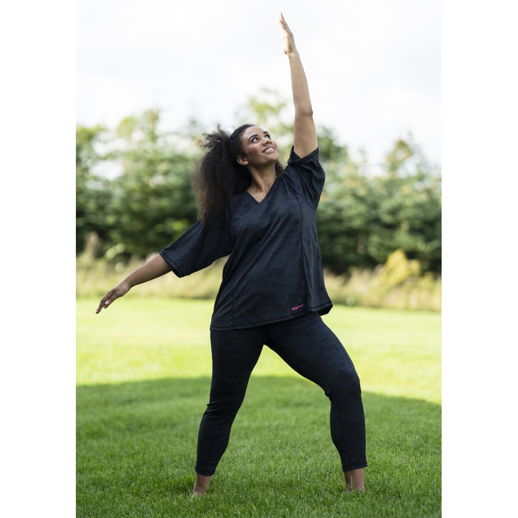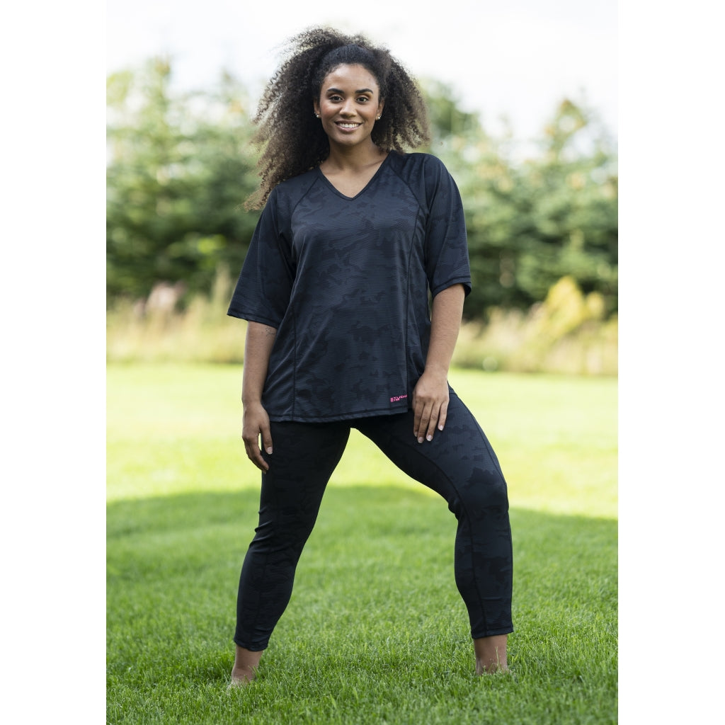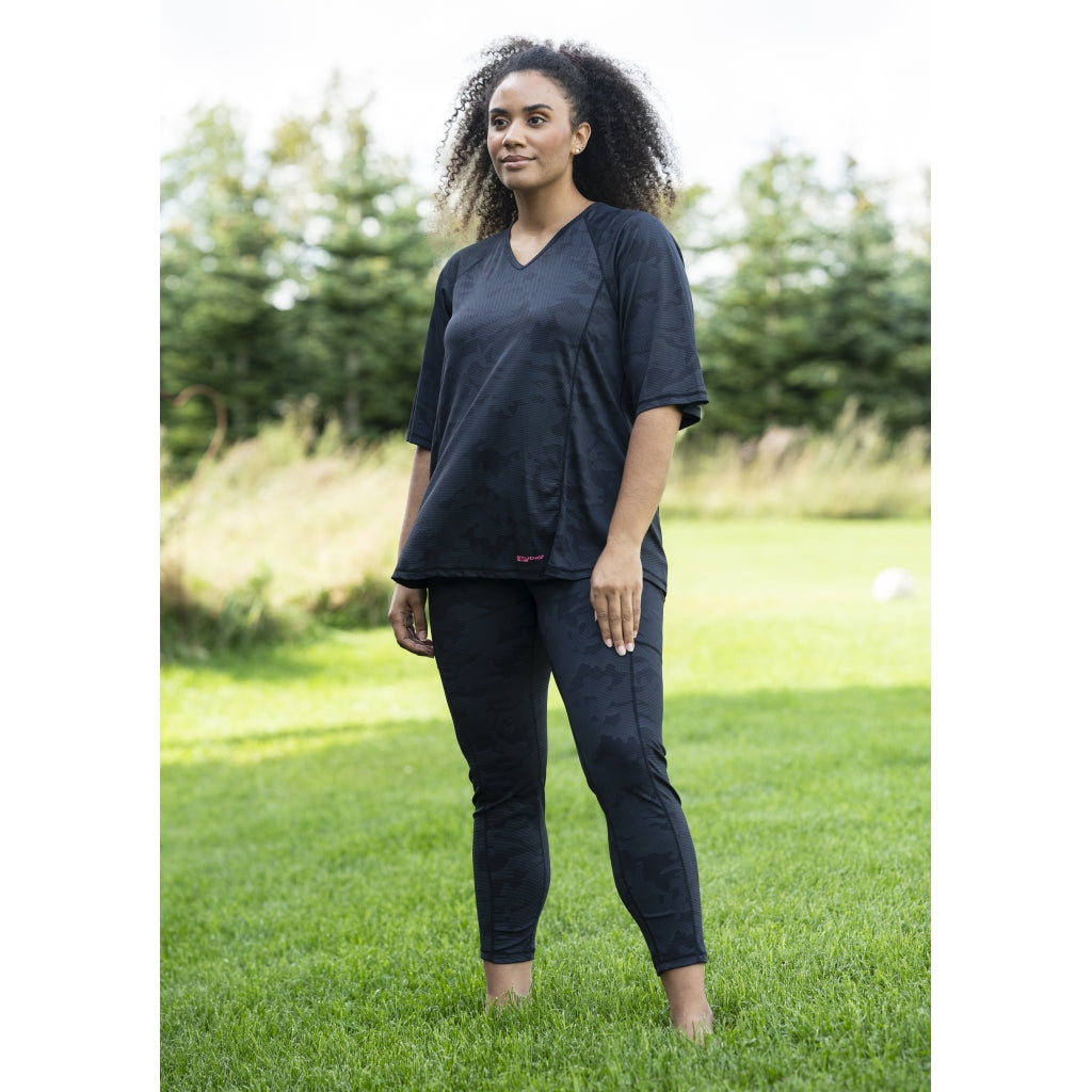 Et par fede fitness leggings i 7/8-længde lavet af nylon-polyestermix. Stylen er med sort og grå camouflage print. Bred elastikkant i taljen og tætsiddende fit.