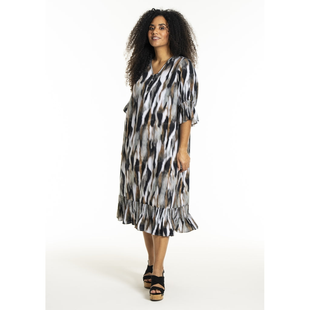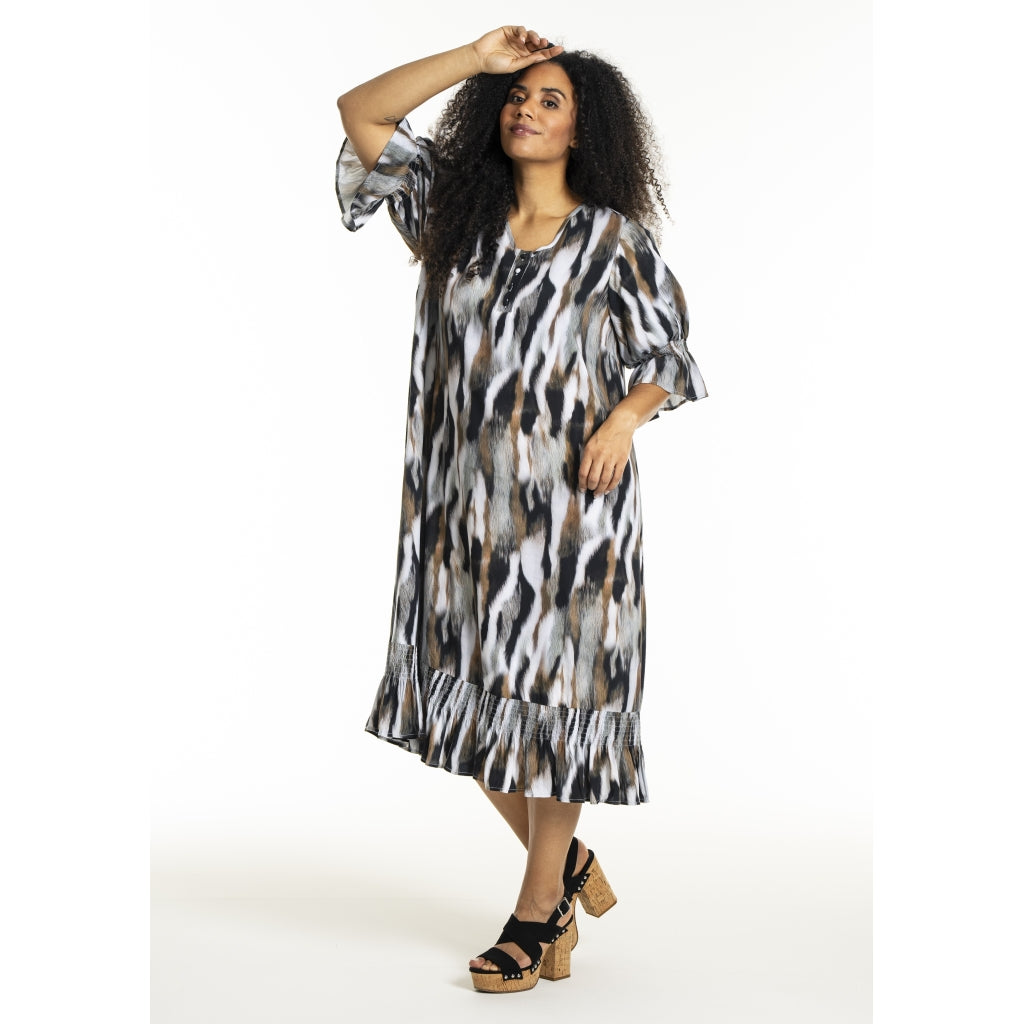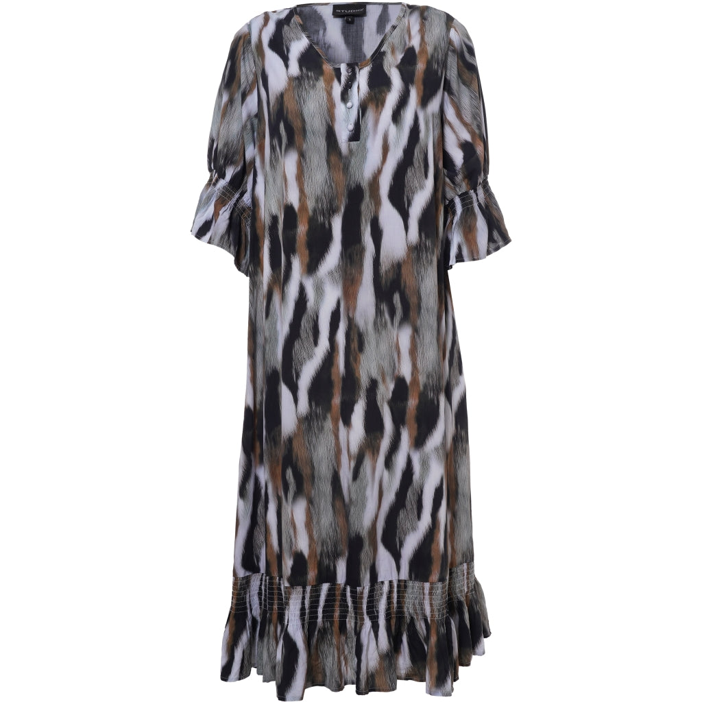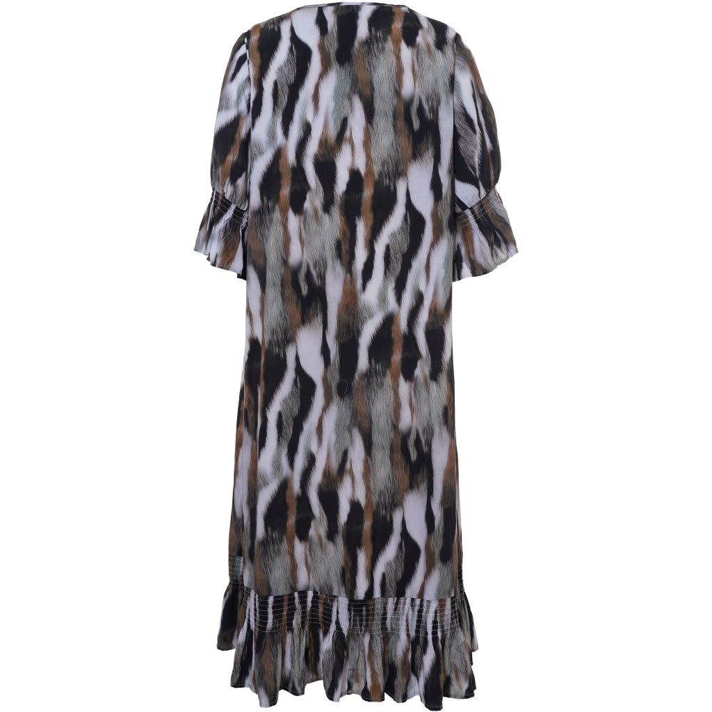Lækker viskoseprintet kjole i mix af sort, grå, brun og hvid. Kjolen er med flot V-halsudskæring med kort knaplukning. Albuelange ærmer med smock og flæsekant, som matcher flæsekanten i bunden.