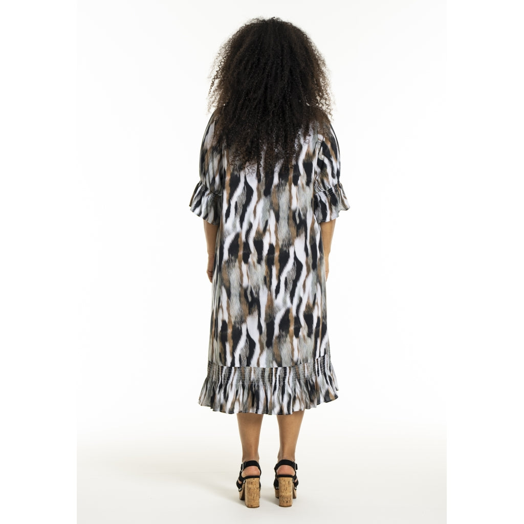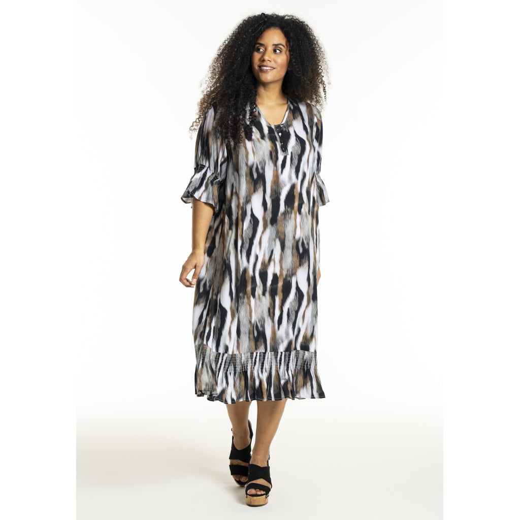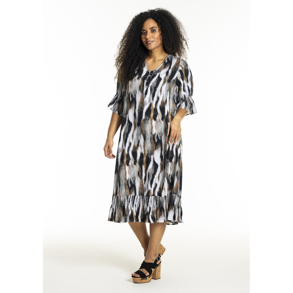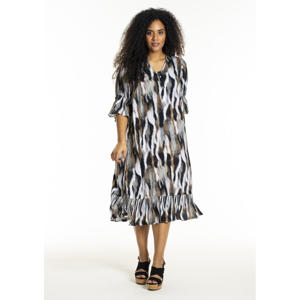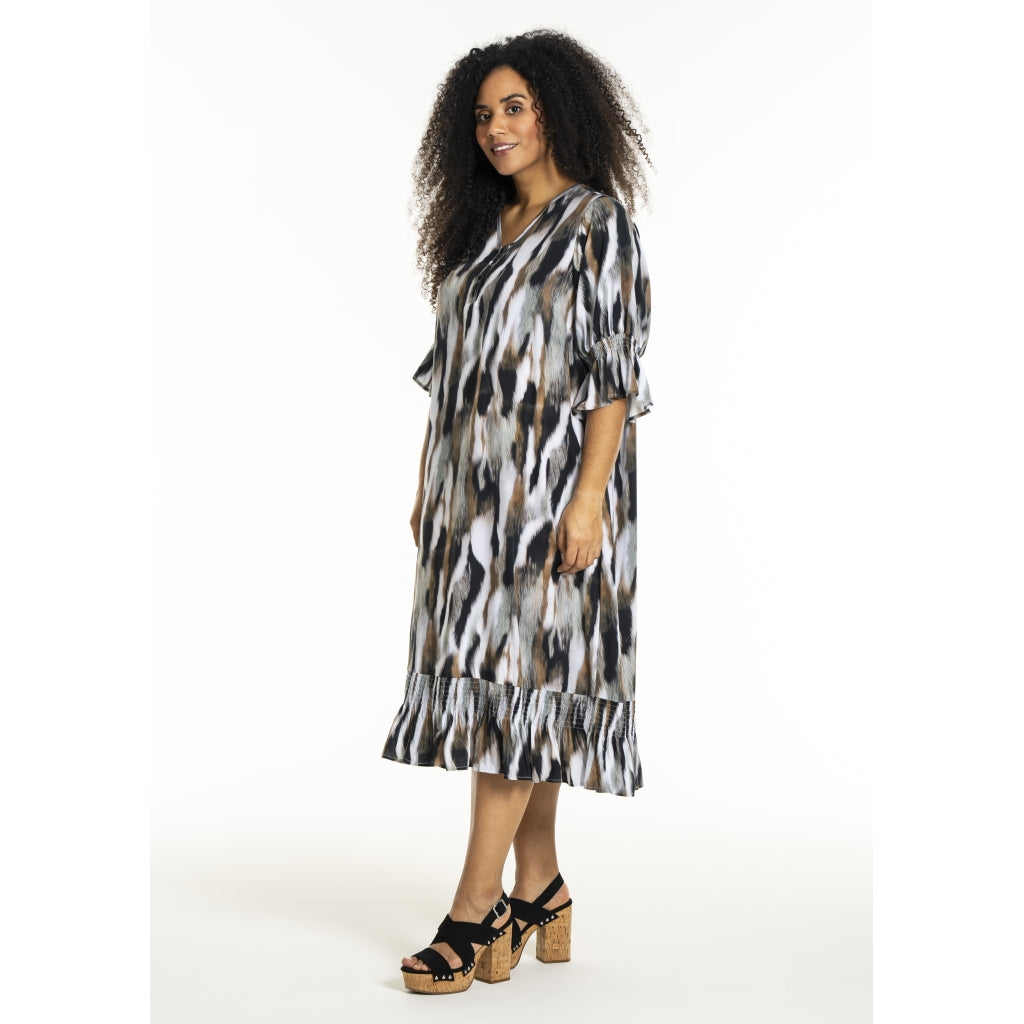 Lækker viskoseprintet kjole i mix af sort, grå, brun og hvid. Kjolen er med flot V-halsudskæring med kort knaplukning. Albuelange ærmer med smock og flæsekant, som matcher flæsekanten i bunden.