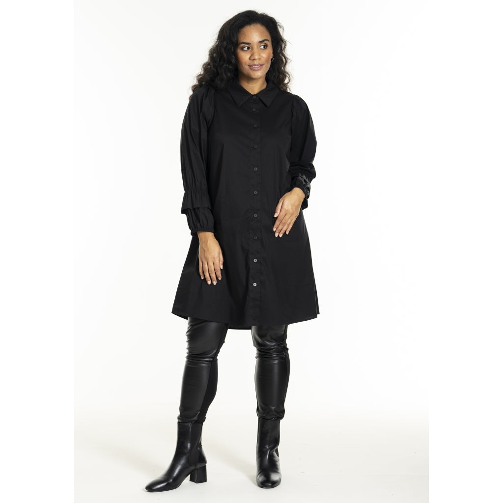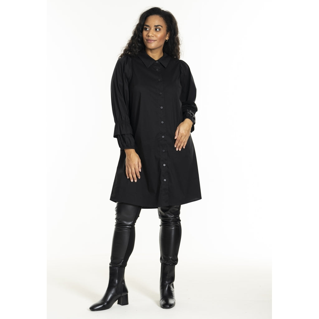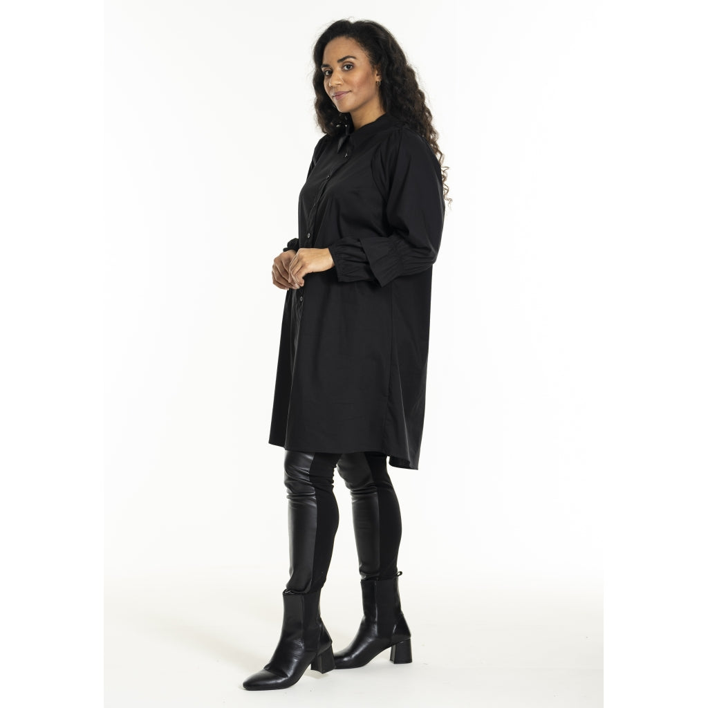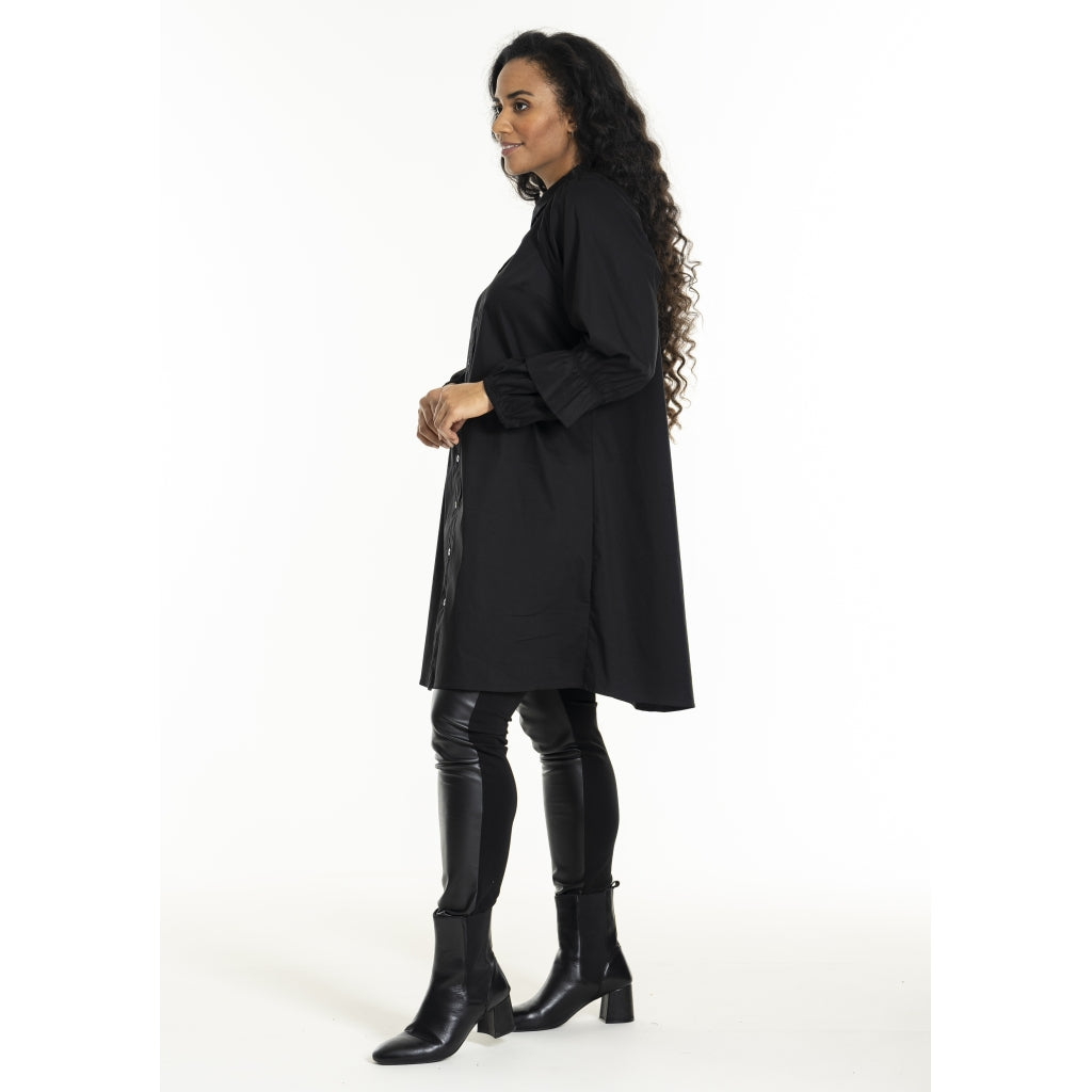 Elegant, lang, ensfarvet skjorte i mix af bomuld, nylon og elastan. Fine ærmer med lagdelt detalje ved manchetterne. Gennemgående knaplukning og skjortekrave.
