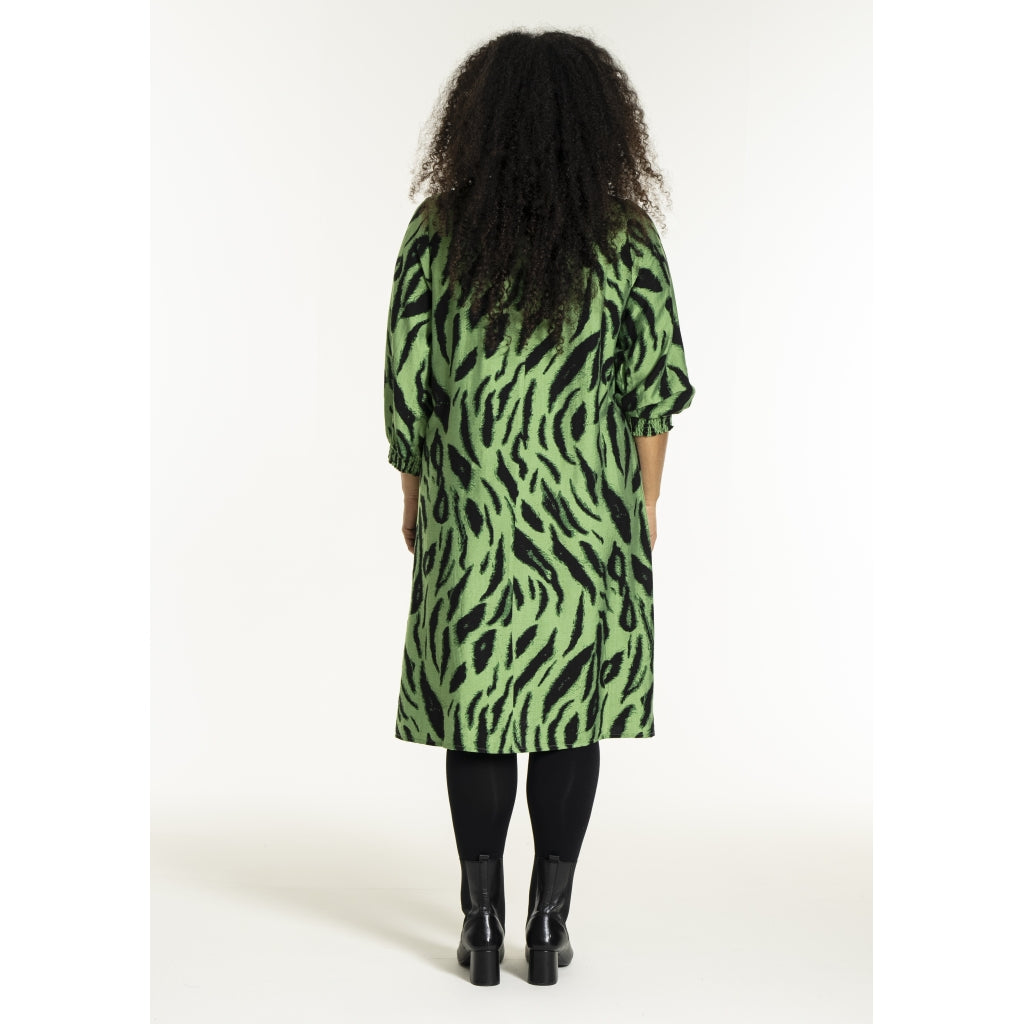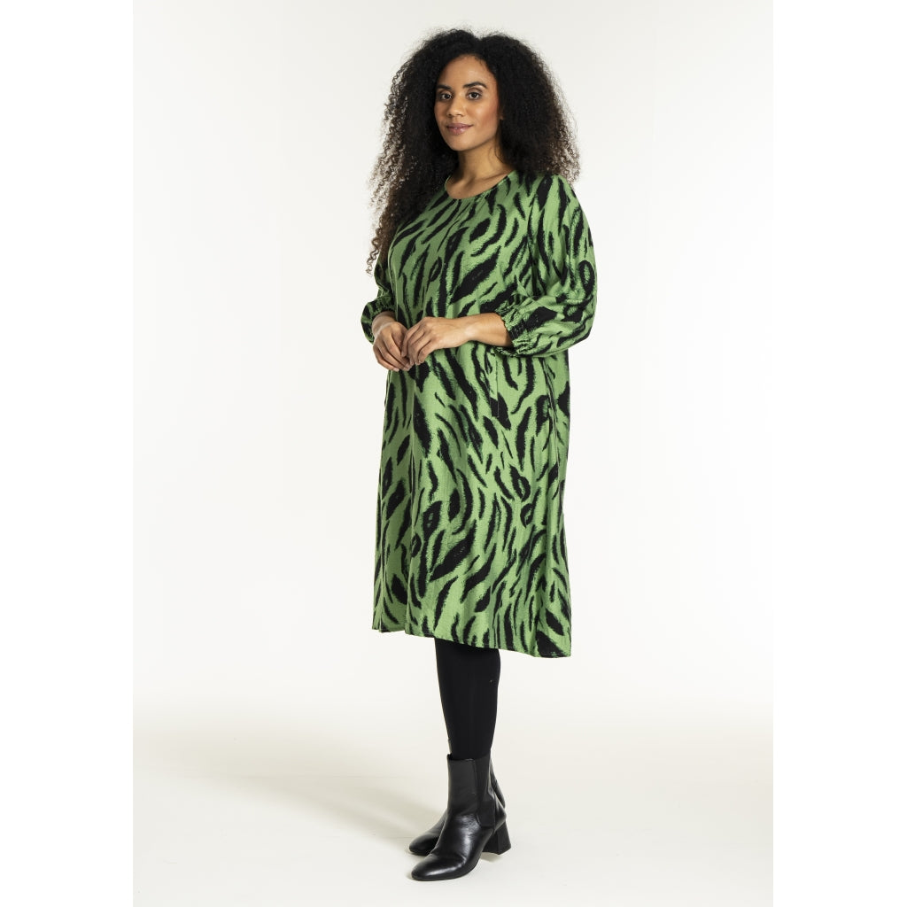 Lang kjole med moderne print i sort på grøn bund. Kvaliteten er en vævet blanding af 85% viskose og 15% nylon, hvilket giver stoffet et let strukturpræg og smukt fald. Kjolen har rund halsudskæring og 3/4 lange ærmer med smockmanchet. Det lange snit giver en elegant silhuet, der falder flot omkring kroppen.