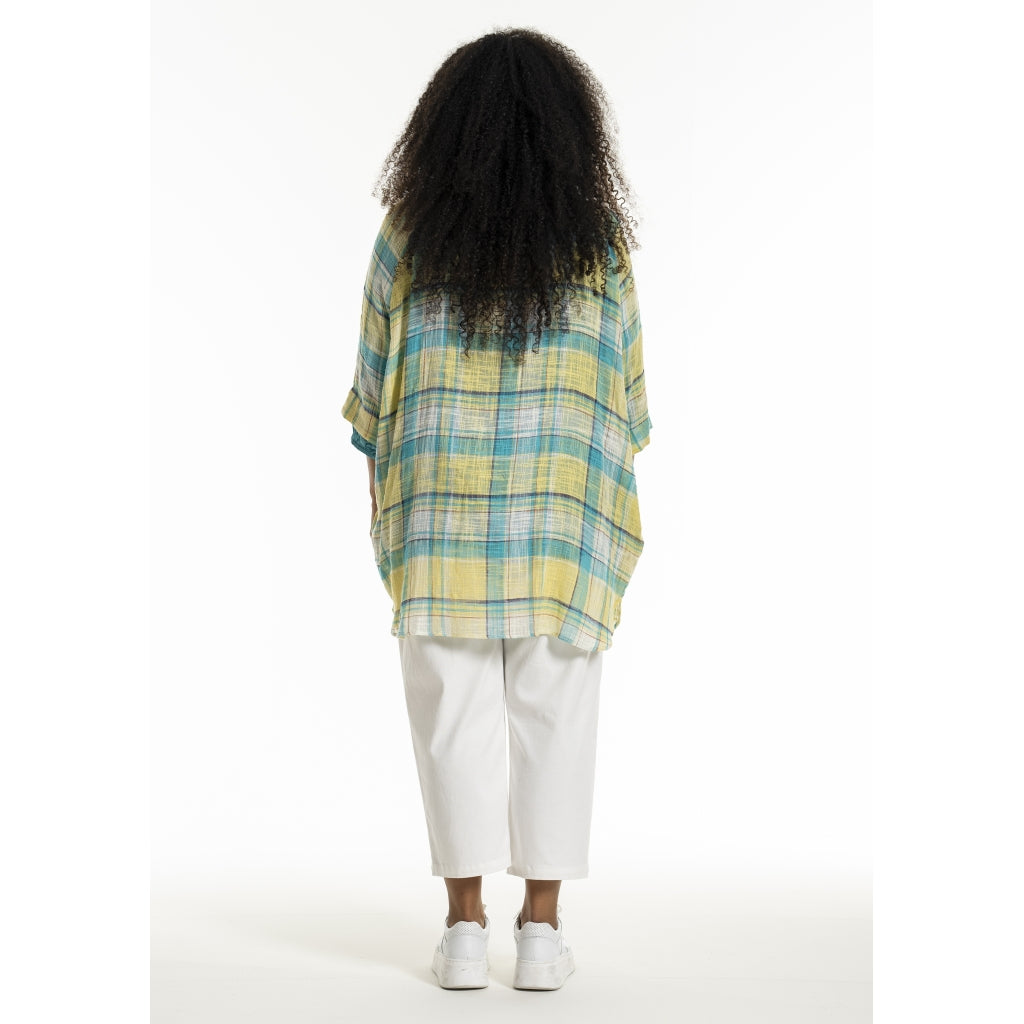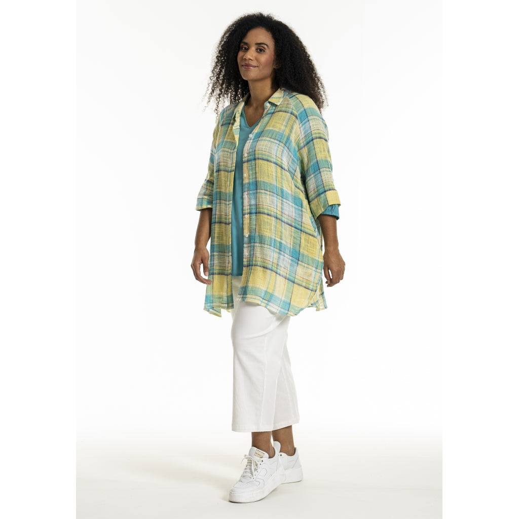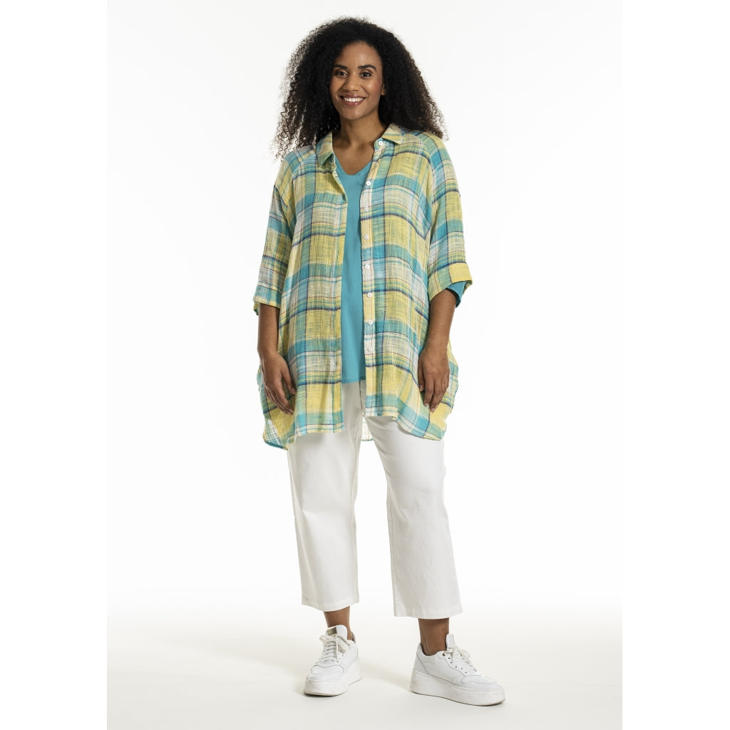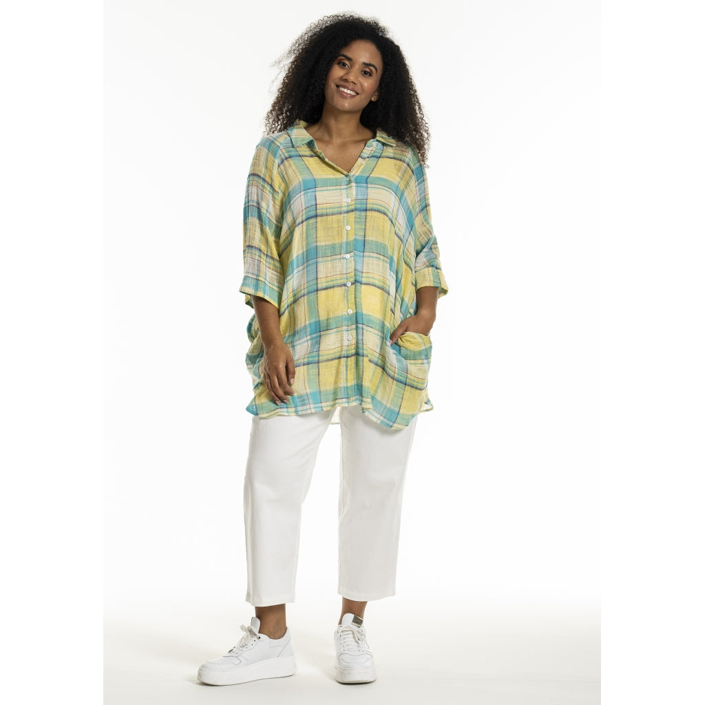 Flot skjorte i 100% bomuld med tern i gule g blå farver. Denne style er med skjortekrave, gennemgående knaplukning og 3/4 ærmer samt lommer.