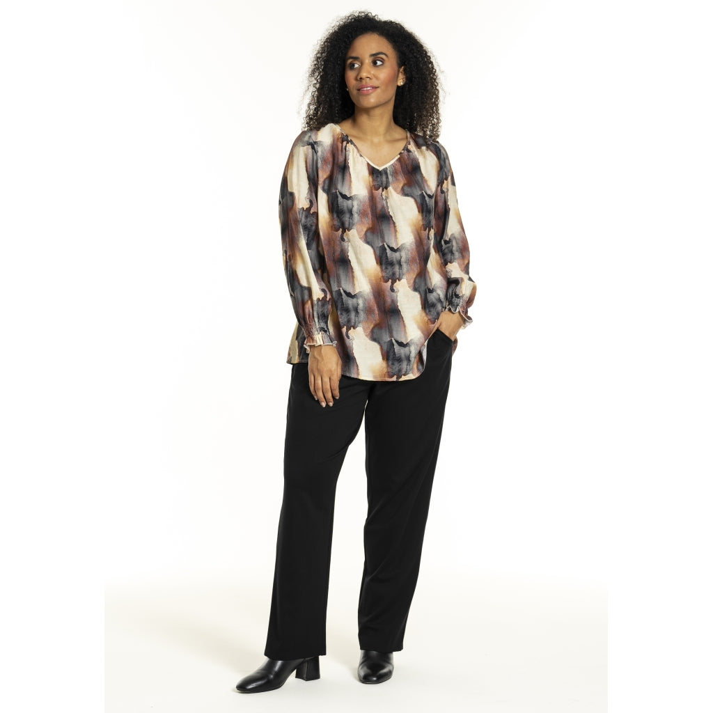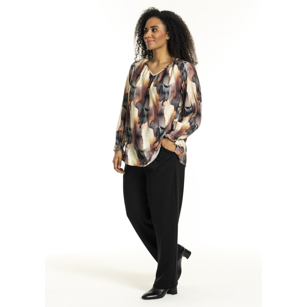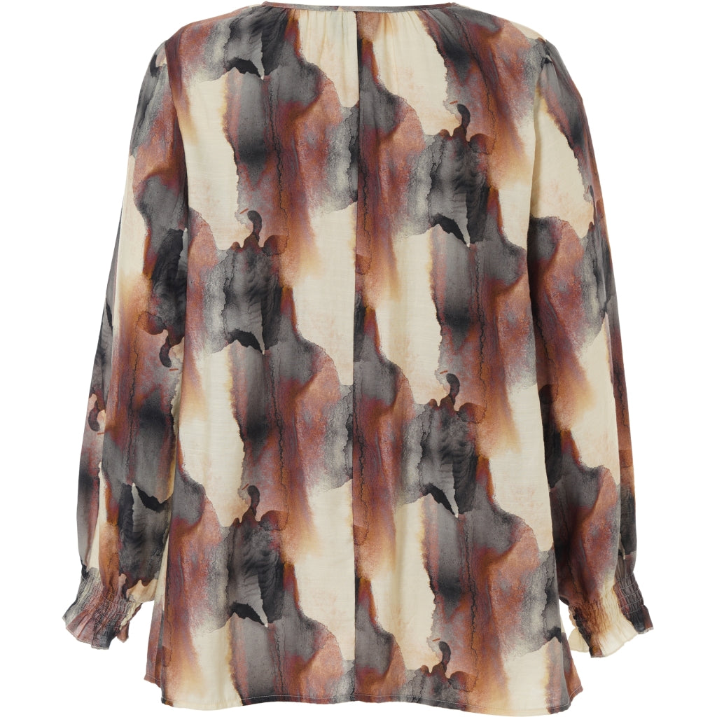 Elegant bluse i viskose-nylon mix med mørkt/rustent print på off-white baggrund. Fin V-halsudskæring og lange ærmer med smock manchetter samt dekorativt fold i ryggen.