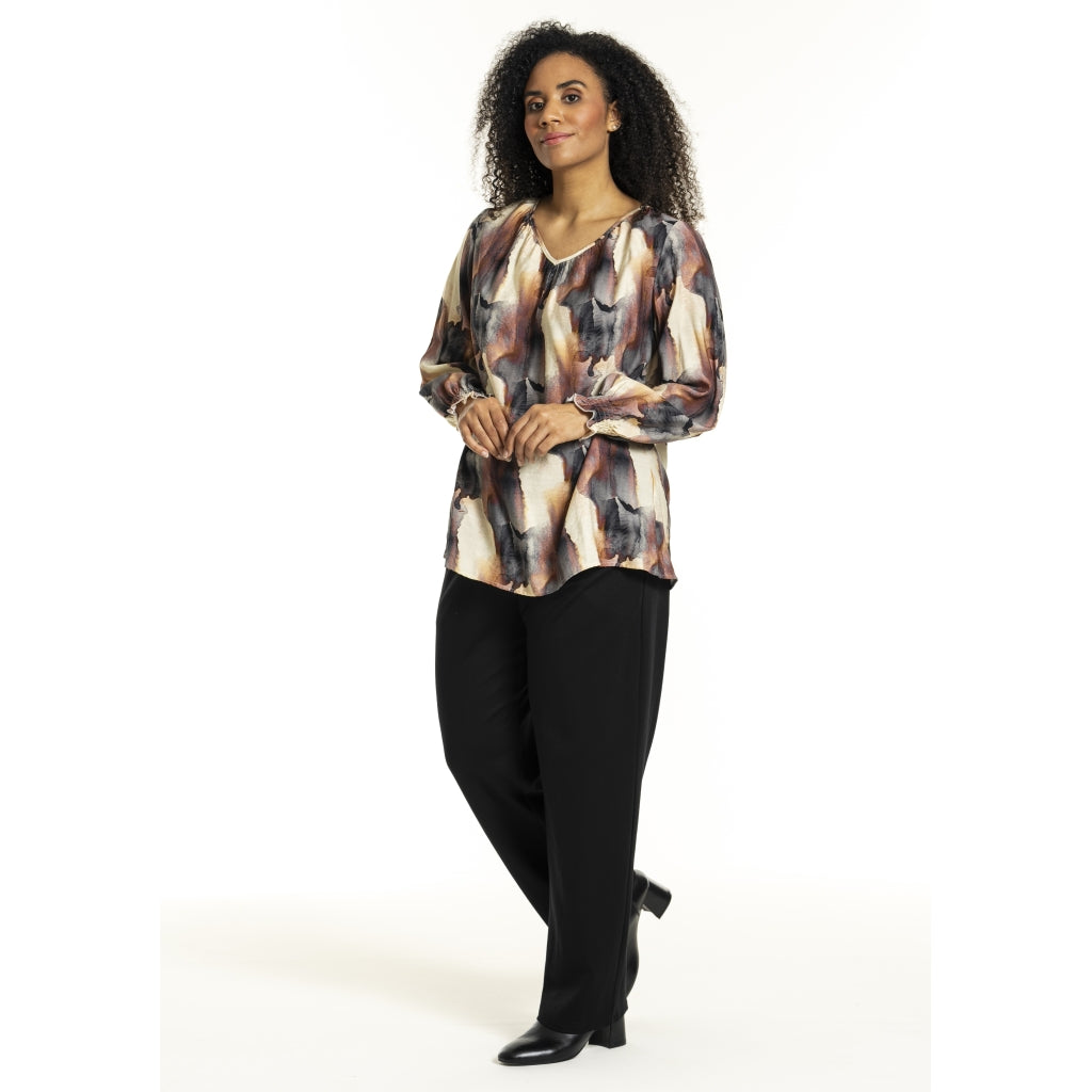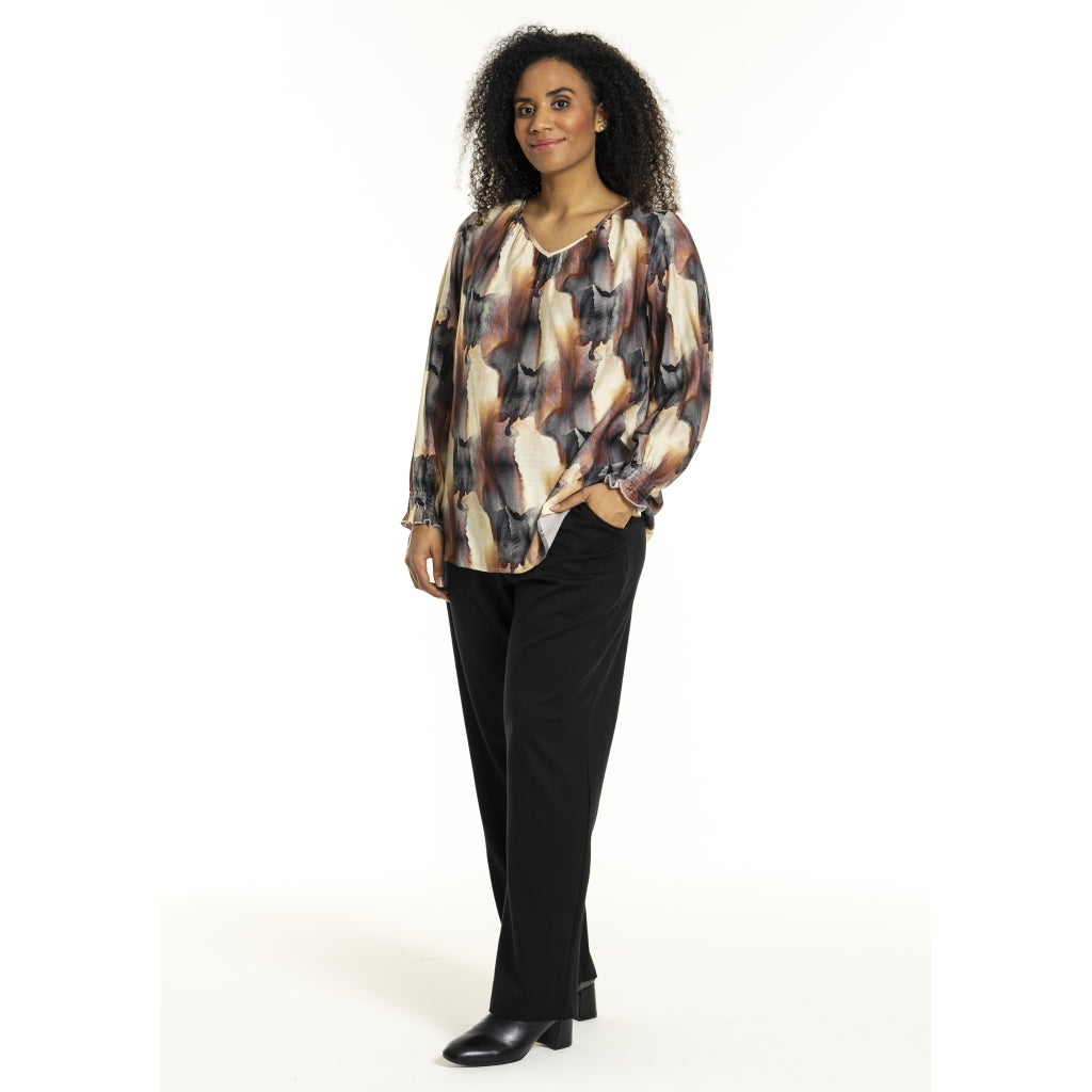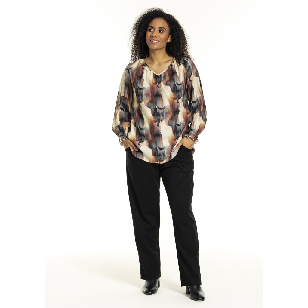 Elegant bluse i viskose-nylon mix med mørkt/rustent print på off-white baggrund. Fin V-halsudskæring og lange ærmer med smock manchetter samt dekorativt fold i ryggen.