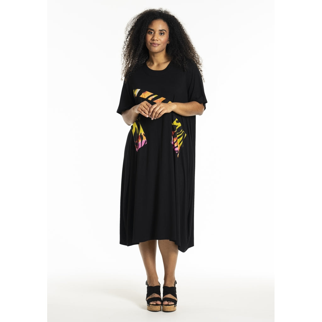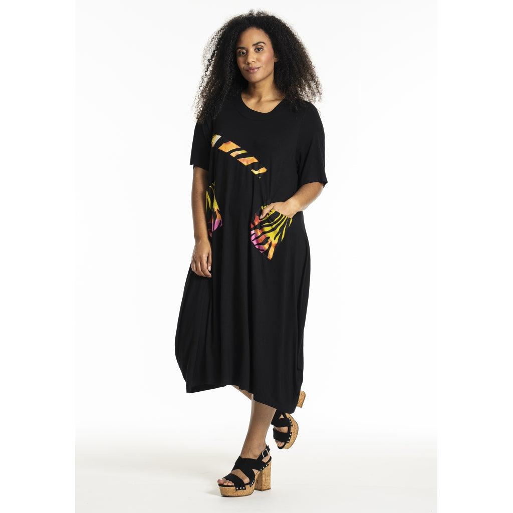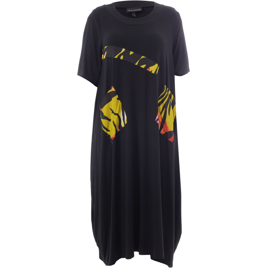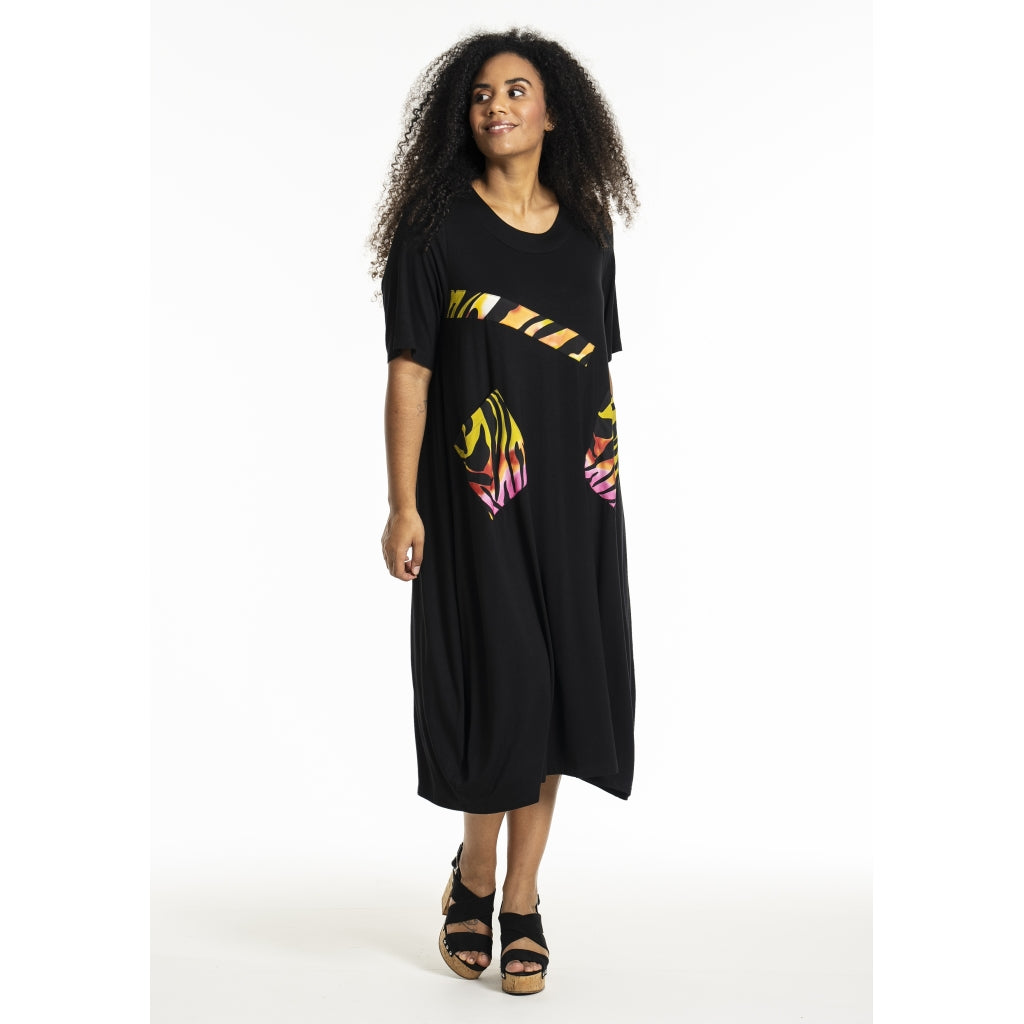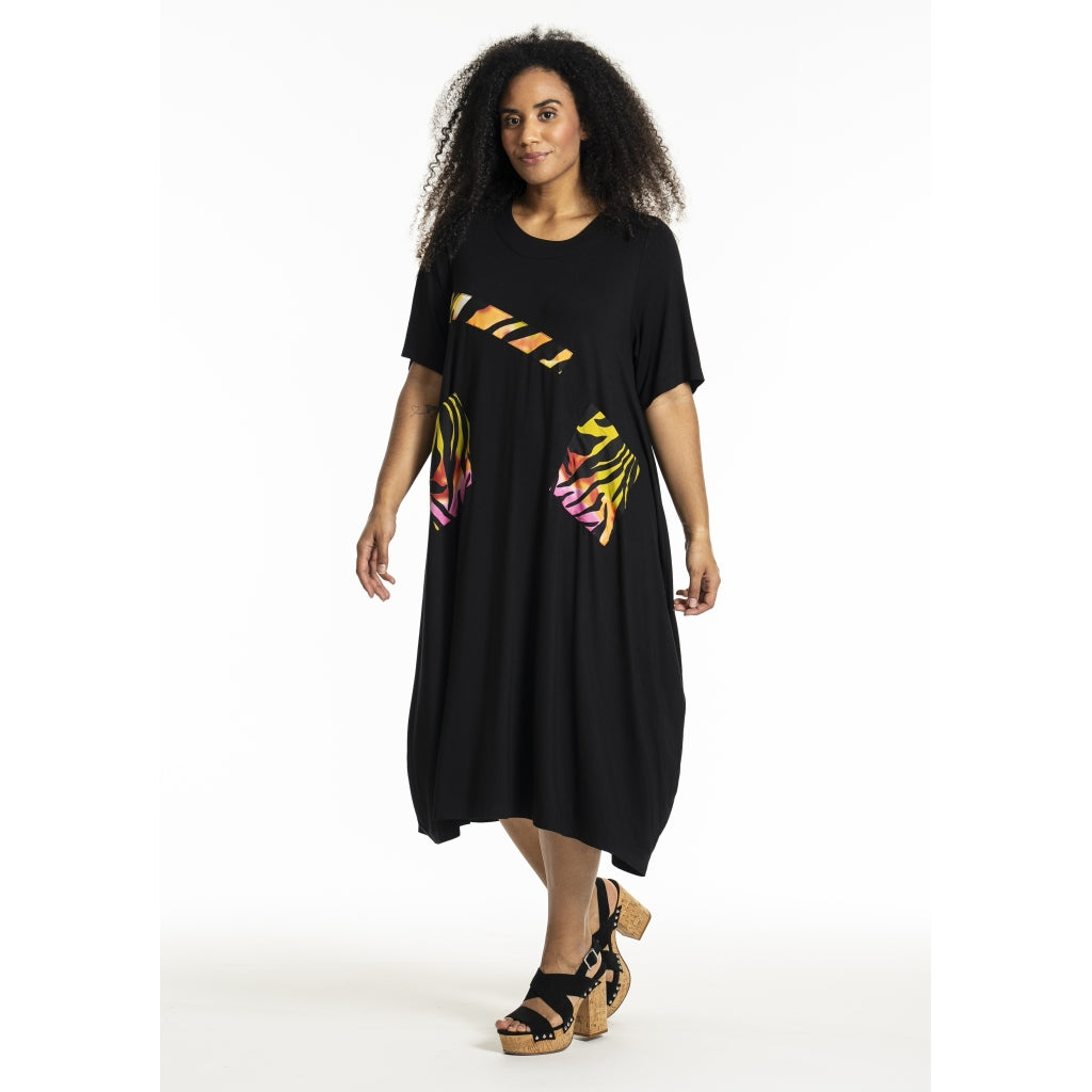 Lækker, ensfarvet jersey kjole i viskose-elastane mix med påsyet viskoseprintet bånd over brystet samt lommer. Printet er multifarvet med sorte tigerstriber.