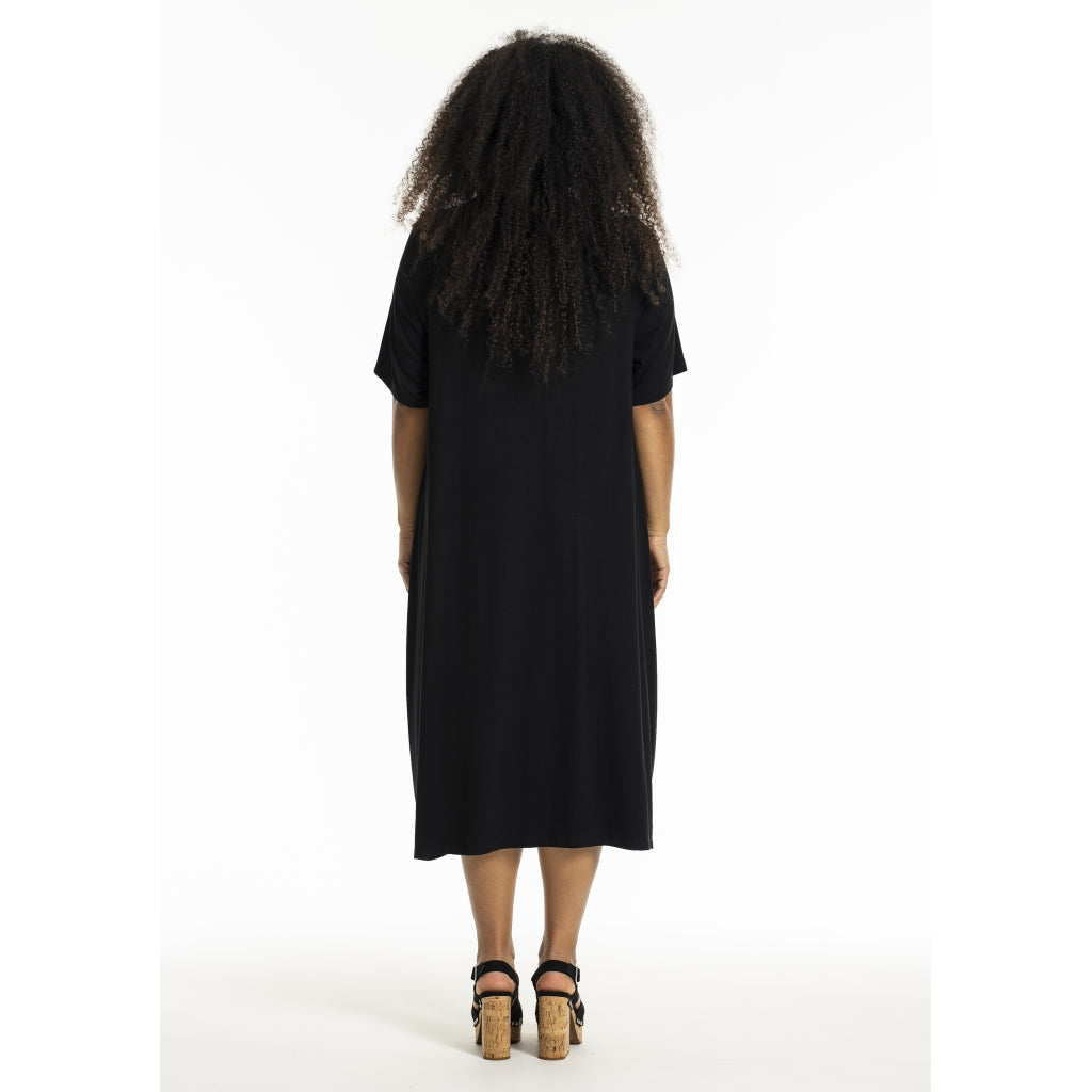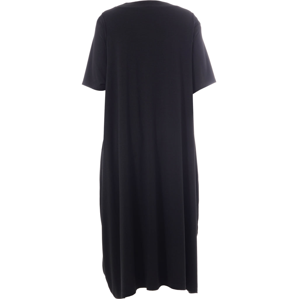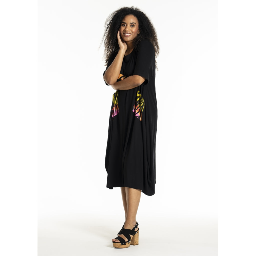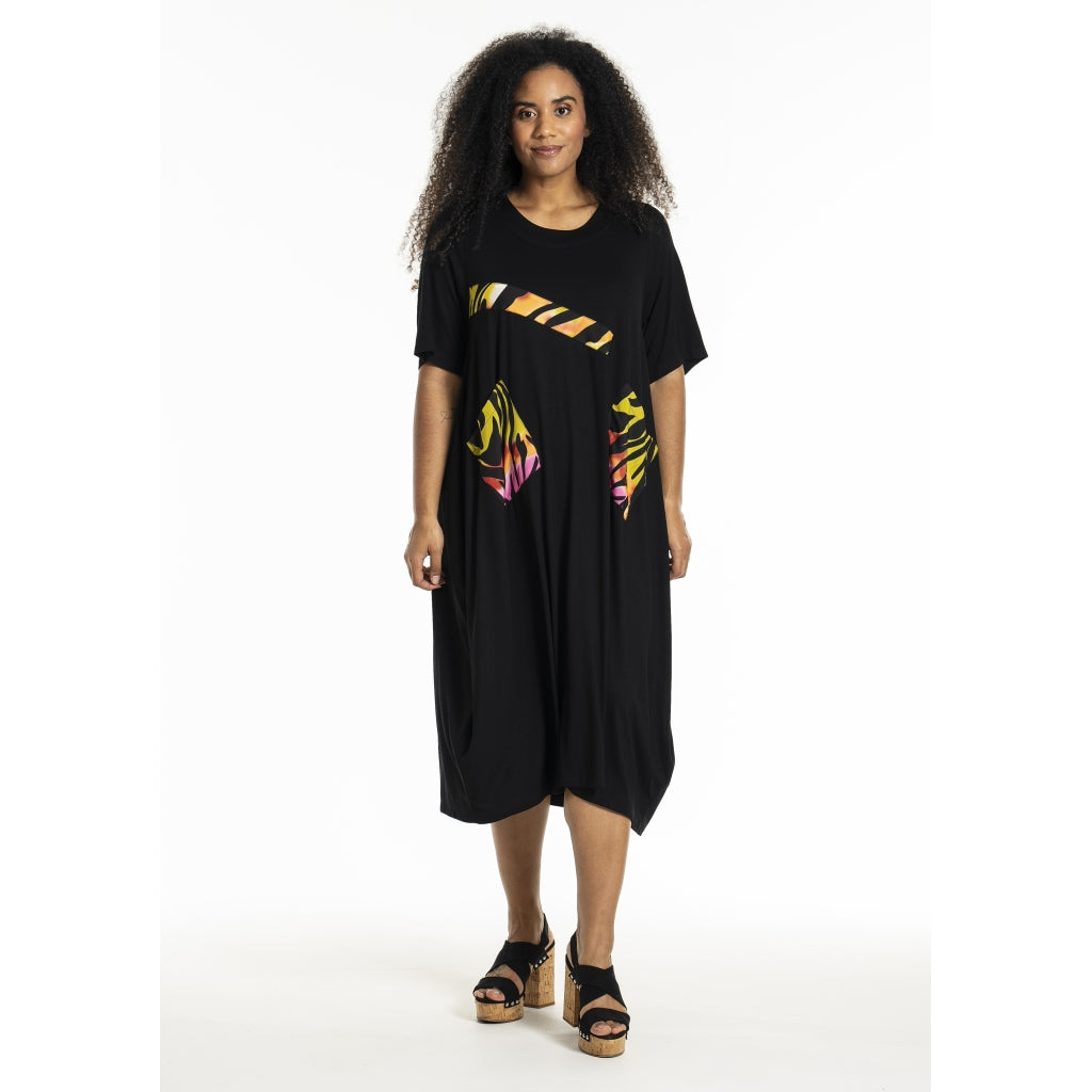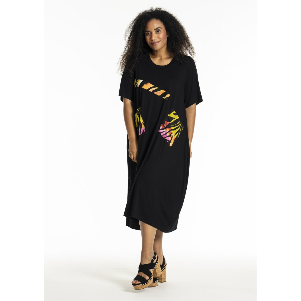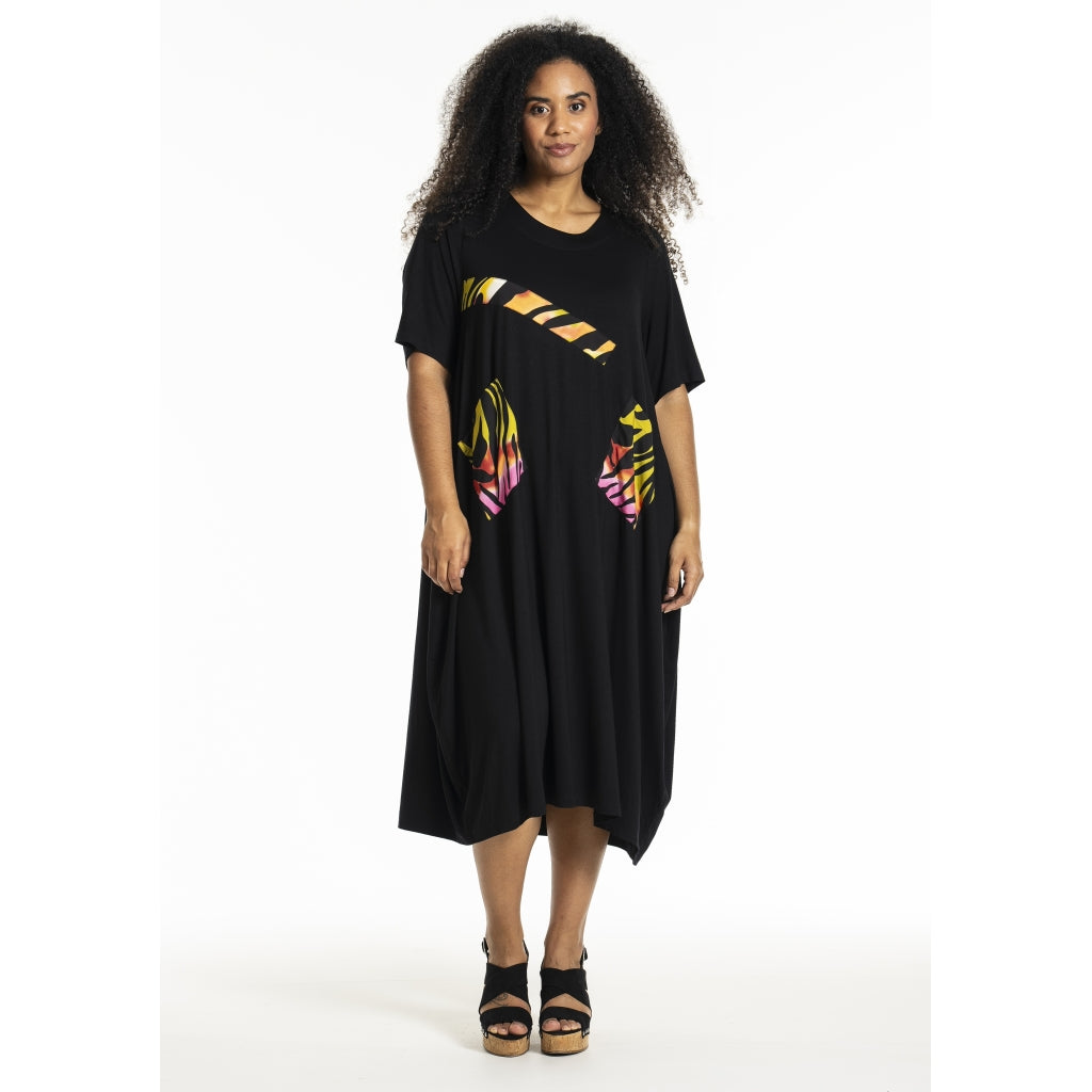 Lækker, ensfarvet jersey kjole i viskose-elastane mix med påsyet viskoseprintet bånd over brystet samt lommer. Printet er multifarvet med sorte tigerstriber.