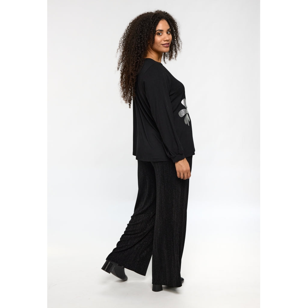 En elegant bluse i 92% viskose og 8% elastan, der kombinerer et klassisk sort grunddesign med fine guld- eller sølv detaljer i blomstermønsteret. Designet har lange ærmer og en løs pasform, hvilket giver et sofistikeret udseende - ideelt til både hverdagsbrug og særlige lejligheder.