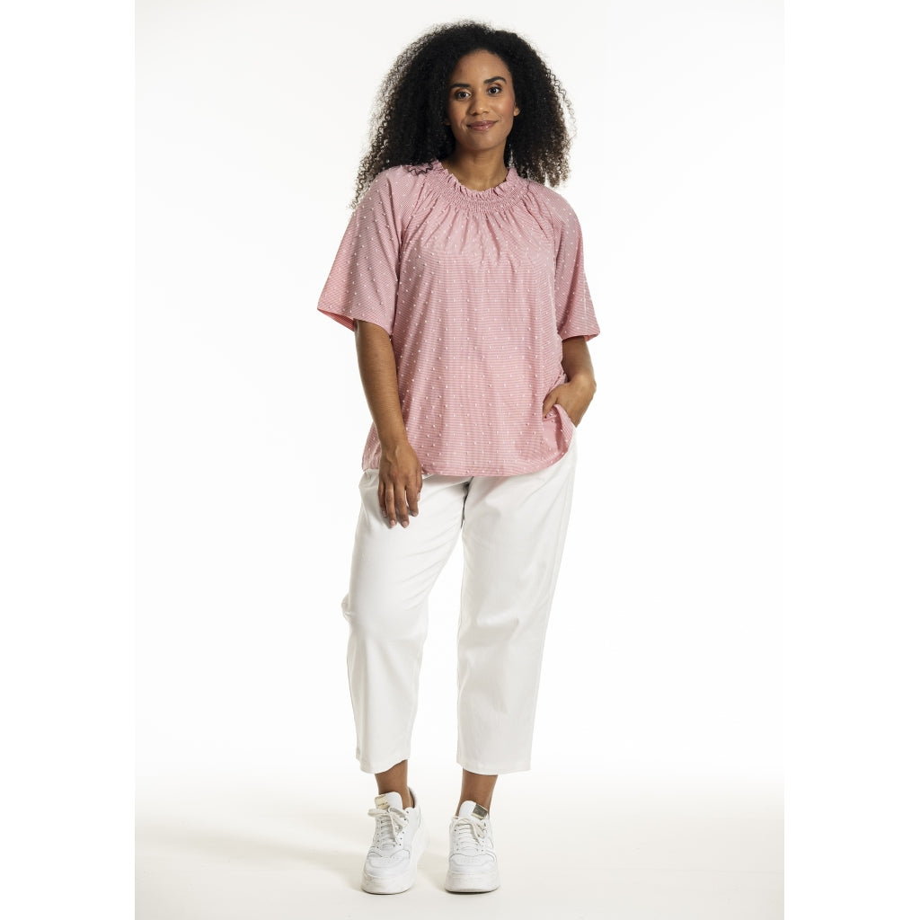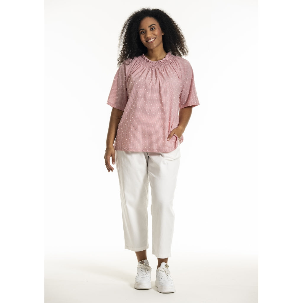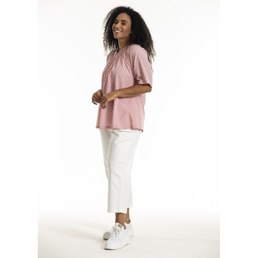 Lækker bluse i polyester-elastane mix striber og små stofprikker. Fin elastik O-halsudskæring, der giver effekt af læg på brystet. Korte albuelange ærmer.