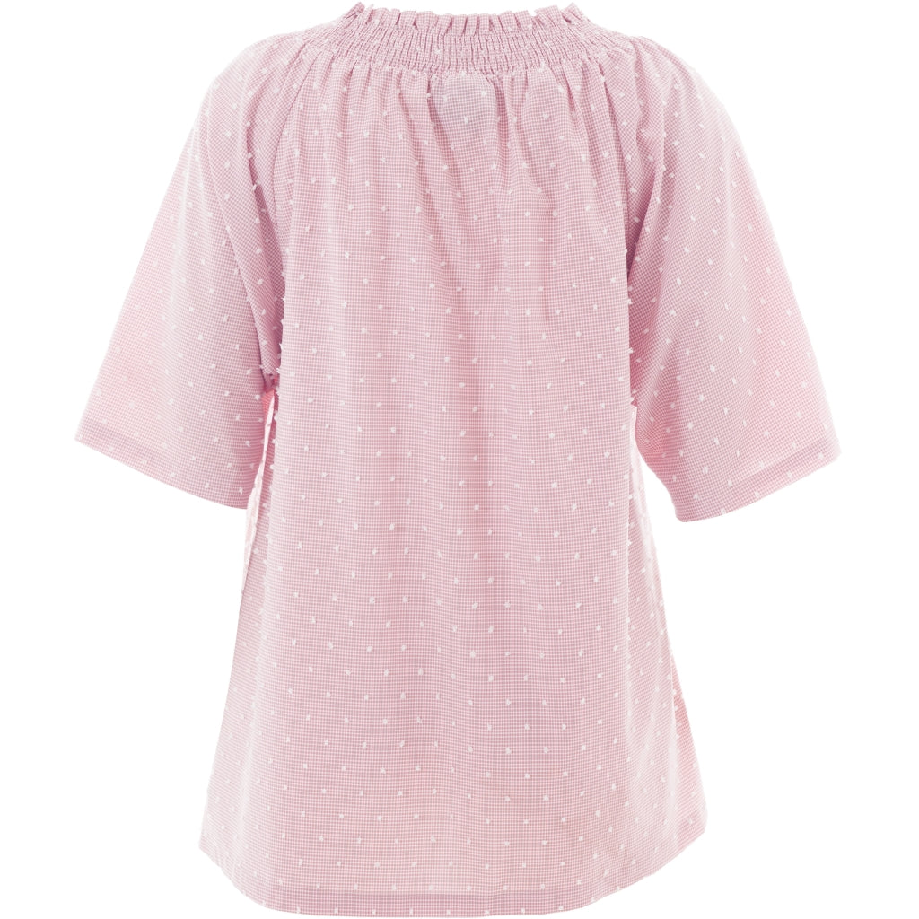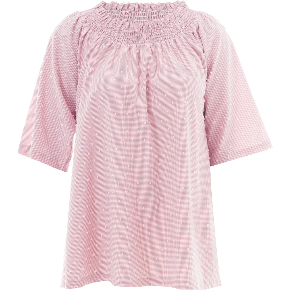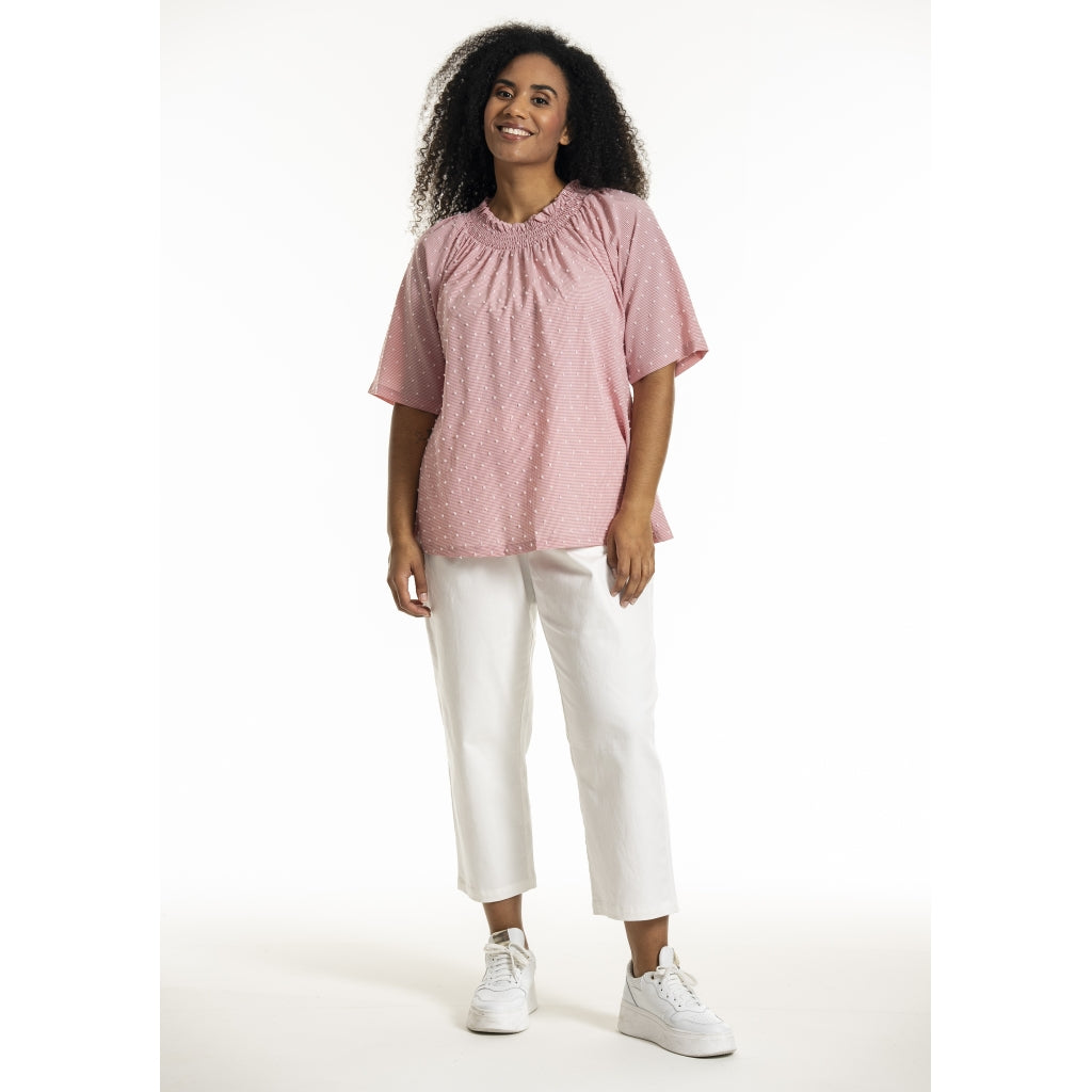 Lækker bluse i polyester-elastane mix striber og små stofprikker. Fin elastik O-halsudskæring, der giver effekt af læg på brystet. Korte albuelange ærmer.