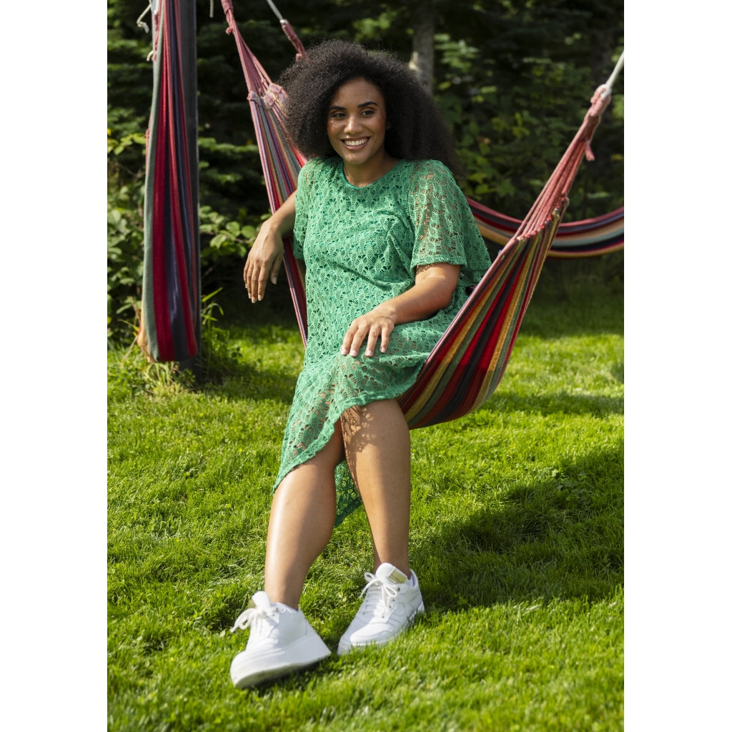 Flot, ensfarvet kjole i to lag, inderste af viskose-elastane, jerseykvalitet og det yderste i elastisk polyester. Stylen er med O-halsudskæring, albuelange ærmer og sømkant, der ender i V-form.